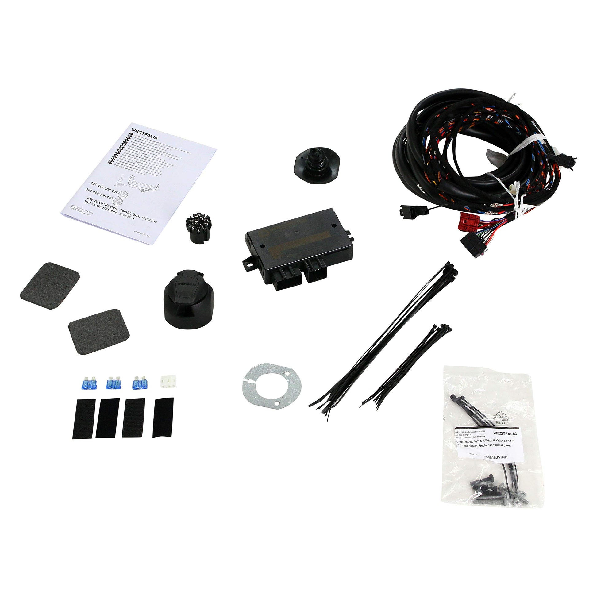 ["The 13-pin, vehicle-specific electrical kit ensures the operation of lighting, comfort, and safety functions (such as error messages in the cockpit and trailer stabilization) when using a trailer hitch","Reliable, precise, and visually appealing: Westfalia-Automotive develops manufacturer-specific electrical kits and trailer hitches in OE quality in collaboration with the automotive industry as the inventor of the car trailer hitch","Thanks to EU approval, the electrical kit can be used throughout Europe without being noted in the vehicle documents by the TÜV - safe and comfortable driving with a trailer or bike carrier","Scope of delivery: 1 x Westfalia vehicle-specific 13-pin electrical kit","Car accessories for: Volkswagen Transporter T5 / T6 (van/combi) (from year of construction 05/2012) - only for vehicles with pre-installation for a trailer hitch"]