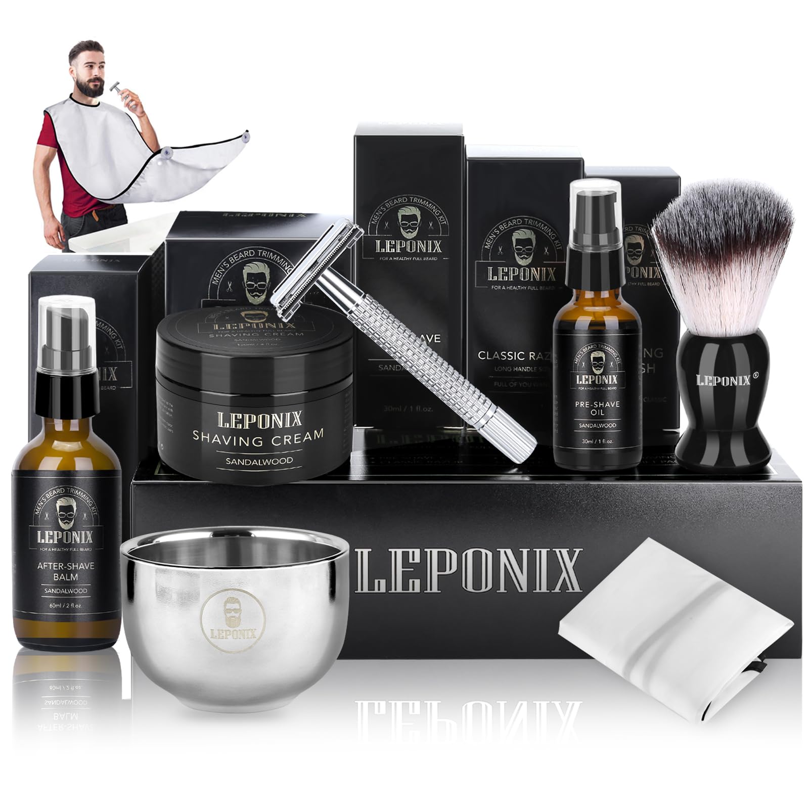 ["Men's Grooming Kit Contains 7 Shave Essentials." This safety razor set is your one-stop station wet shave set with all the parts you need! INCLUDED: Men's safety razor with 10pcs razor blades/shaving brush and bowl/sandalwood pre-shave oil/shaving cream/after-shave balm/shaving apron. 7 Shaving Essentials bring you the most comfortable experience in your daily shave.","Perfect Gifts for Men - Make any man extremely happy with our complete men's wet razor with blades set. Great gift and gift item for fathers, husbands, sons, teenagers, and boys or men's gift on Valentine's Day, birthday, Christmas, Father's Day, and anniversaries.","THE BEST TOP DEAL AND THE BEST QUALITY: This is your best choice as it is the best kit with the best value for money on Amazon so far with the complete shaving set. You don't have to put together all the essential things for shaving to save time. The shaving set includes the highest rated product on the market, giving you full confidence in your purchase as well as our professional customer service.","ALL NATURAL INGREDIENTS: Our shaving cream, aftershave balm, and pre-shave oil have been designed for shaving your beard and for smooth, shaved skin. All natural ingredients, NO additives or harsh chemicals.","Buy with Confidence - We are confident that you will love your new shaving set. If for any reason you are not satisfied with this shaving set, simply contact us and we will take care of it immediately."]