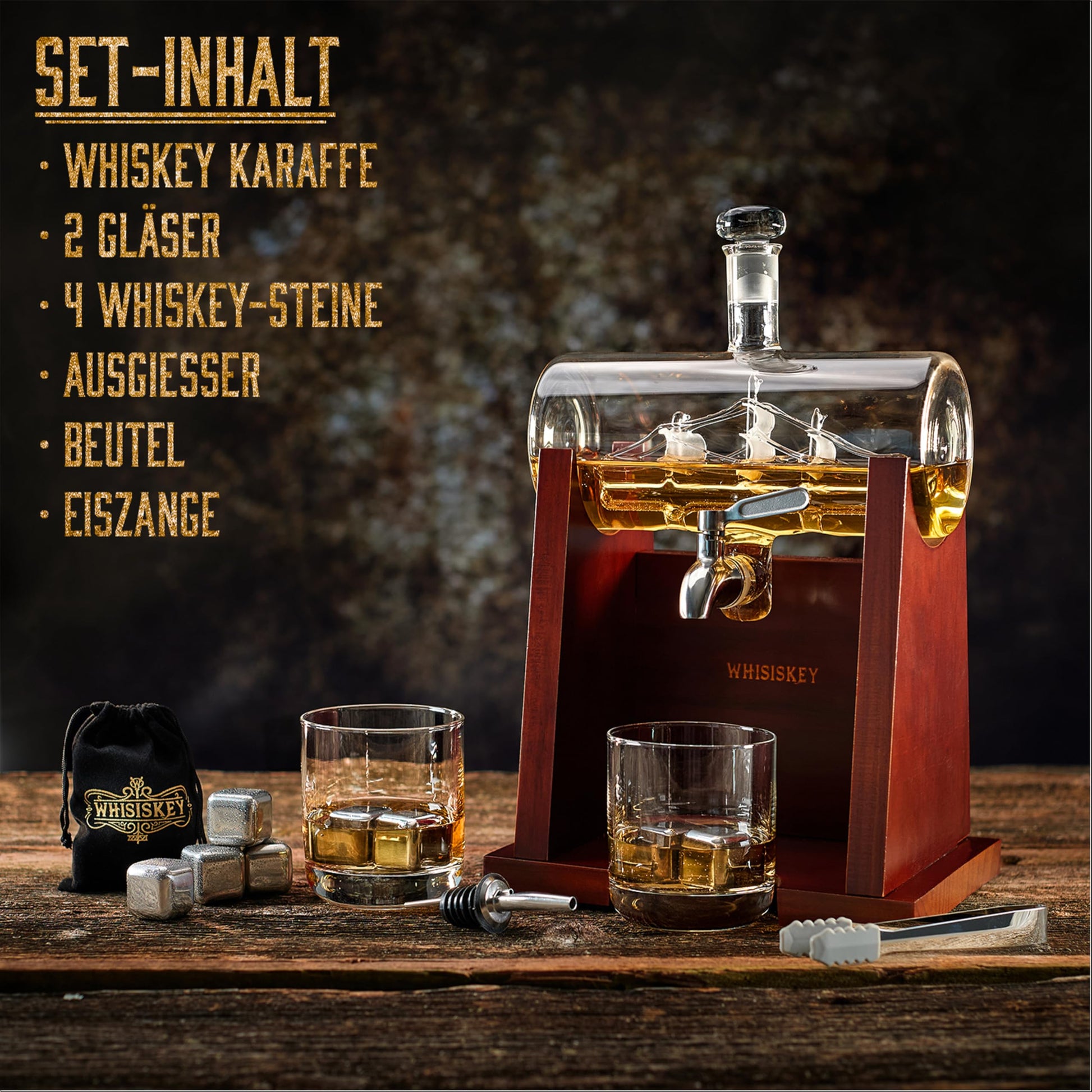 WHISISKEY Decanter Set - Whiskey Gift Set - Gifts for Men - Men's Gift - Birthday Gift for Man - Ship Decanter 1100ML, Gift Box, 2 Whisky Glasses, 4 Whisky Stones