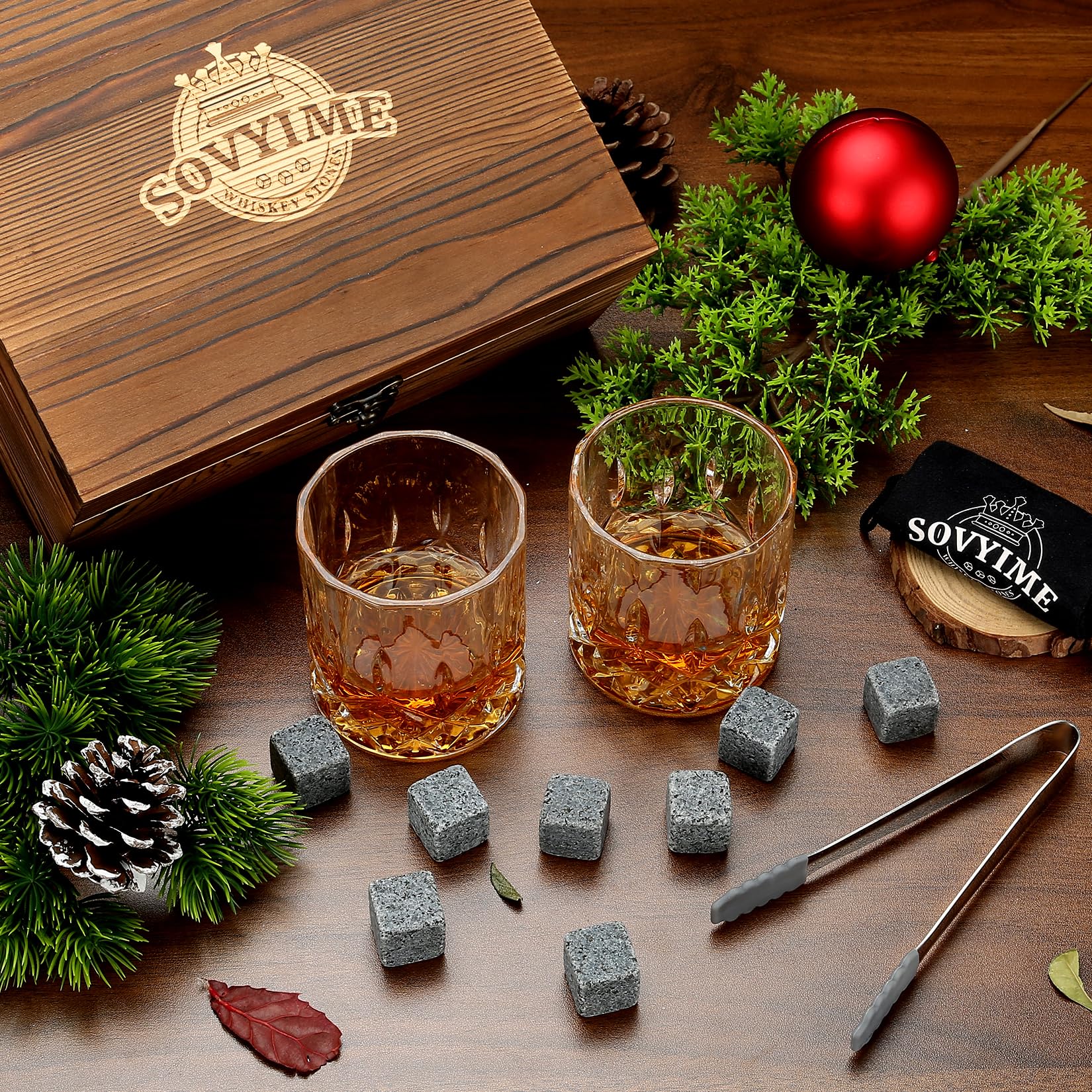 Whiskey Glass Gift Set, Whiskey Stones, Whiskey Gift Sets for Men, 8 Whiskey Stones 2 Crystal Whiskey Glasses Wooden Box Gift, Birthday Gifts for Men, Dad, Husband Valentine's Day (Round)