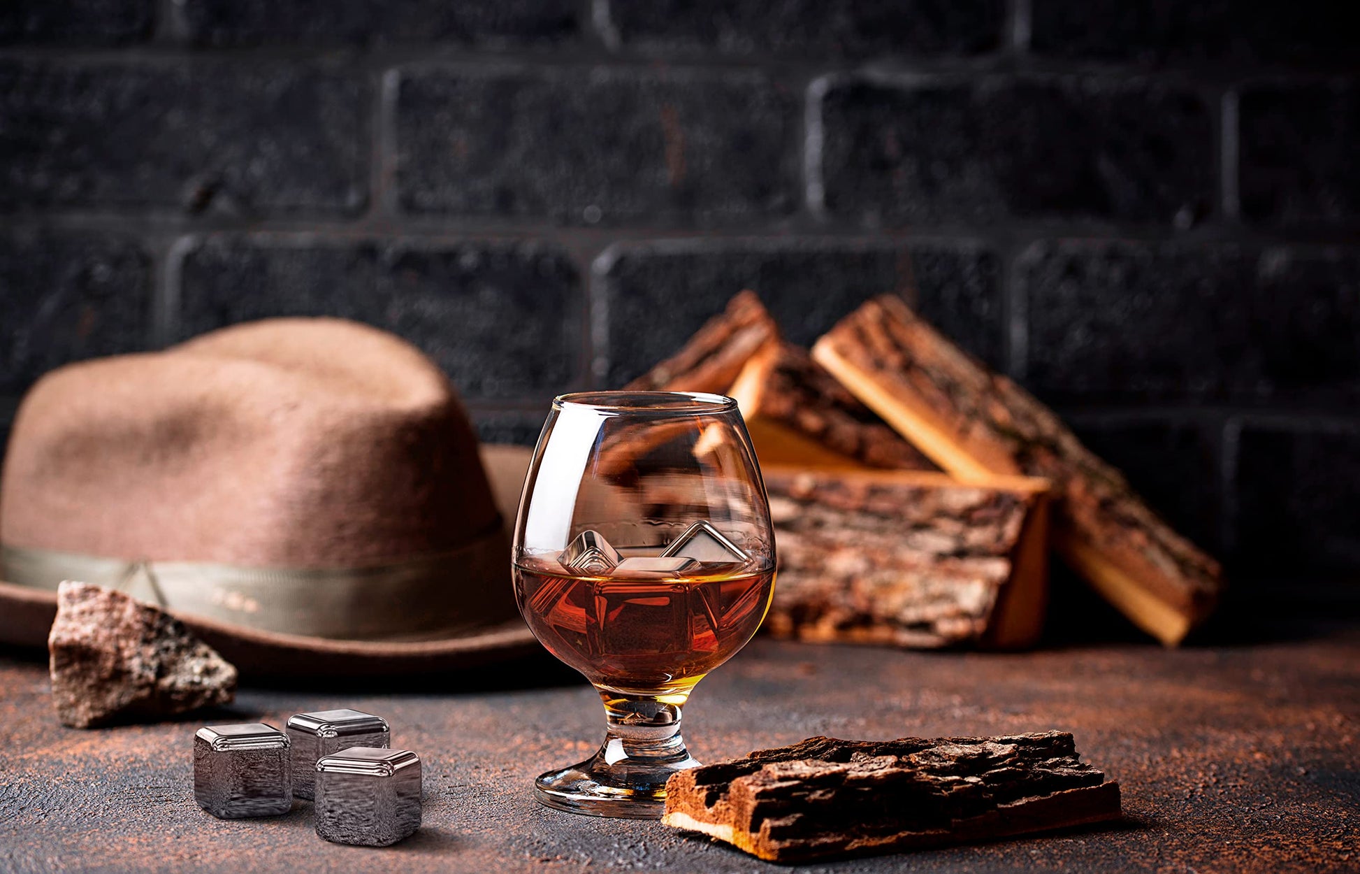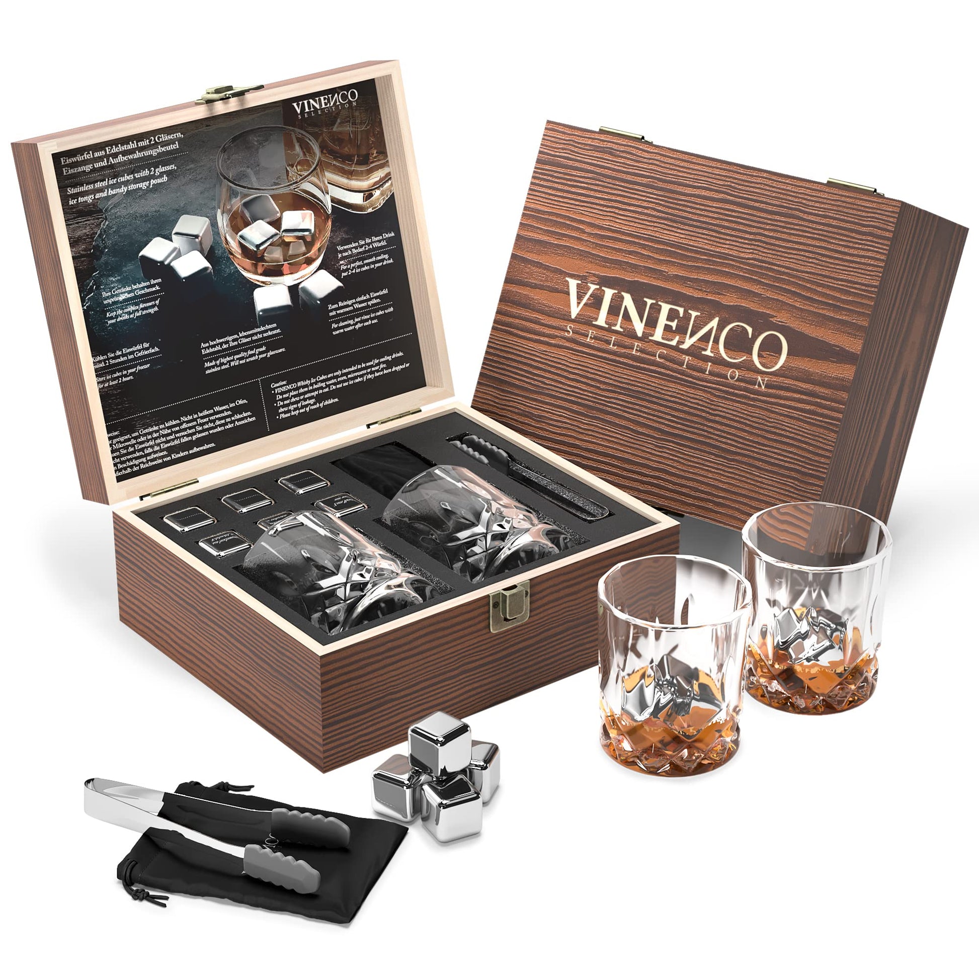 Whiskey Stones Set - 6 reusable stainless steel ice cubes + 2 glasses, tongs | Whiskey Ice Cubes Metal chilling stones bar accessories cocktail rocks gin stones decorative accessories gift whiskey stones.