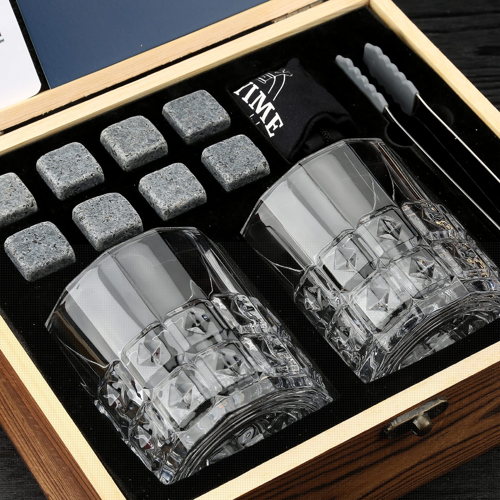 🎁 "Ultimate addition to your man cave: Our premium whiskey stone gift set made of wood consists of 12 items, 2 crystal whiskey glasses (10 oz) for the full flavor of whiskey, bourbon, Scotch, and other alcoholic beverages, 8 natural granite stones to keep the drink cool without dilution, 1 exquisite wooden box, 1 tongs, and 1 velvet bag. A luxurious decoration and collection for your bar and man cave,"