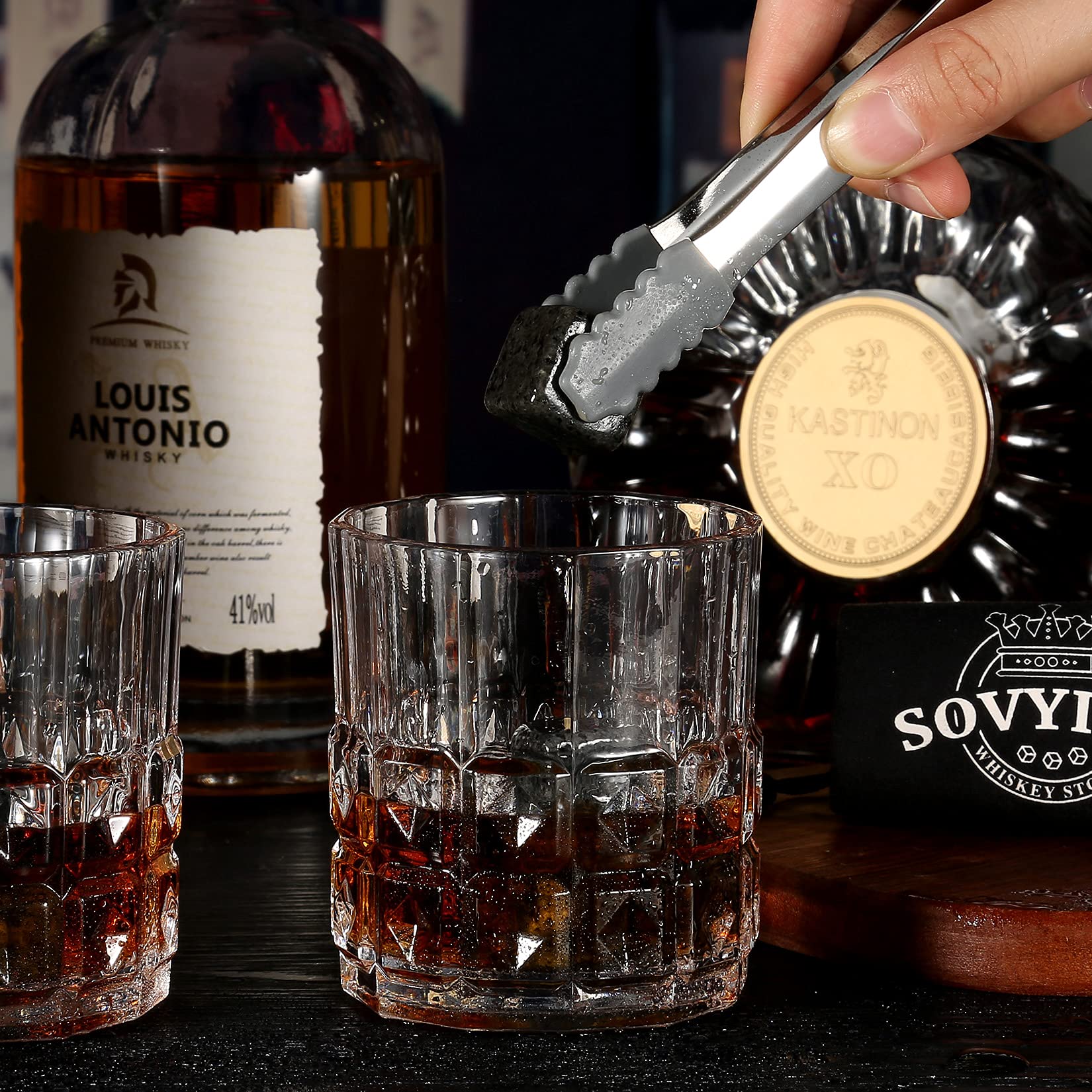 🎁 "Unique Bourbon/Hennessy gifts for men – Our Scotch drinking glasses are made from high-quality, safe, lead-free glass. Whiskey cooling stones made of natural granite serve to cool it perfectly to sip your smooth whiskey. Each polished stone is washable and reusable. Use metal tongs to gently place whiskey stones in stone glasses. Whiskey glass gift set made for you to enjoy a relaxing, perfectly chilled drink,"