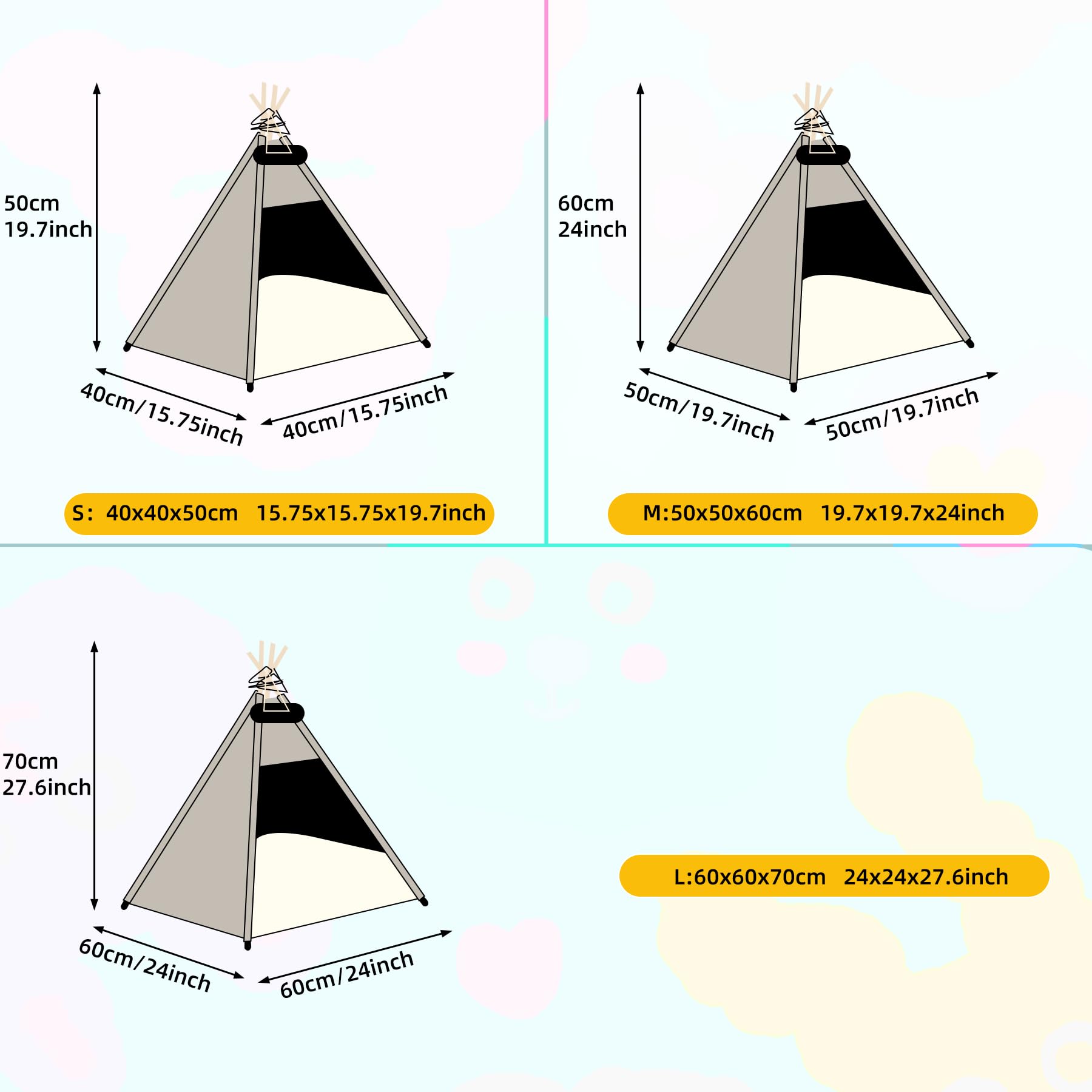 ["HIGH QUALITY:Cotton and breathable, durable fabric, ten high-quality New Zealand pine logs, thick cushion filled with PP cotton.","SUITABLE SIZE:S and M are ideal for small pets under 15 lbs such as cats, rabbits, puppies, teddy bears, etc. L is suitable for pets from 15 to 33 lbs.","FEATURES:This dog tent house provides a safe and comfortable resting place and home decoration. Portable, easy to store, versatile, allowing your pet to enjoy leisure activities indoors and outdoors.","Design:Designed for easy storage, the wooden poles that support the tent are designed for splicing. Each long wooden pole consists of two short wooden poles connected by white connecting pipes. Five black foot covers protect the tent floor and support the stability of the dog tent.","Benefit:The thick cushion can be removed and used separately as a soft pet bed. A cute little board can be hung on the top for writing your pet's name."]