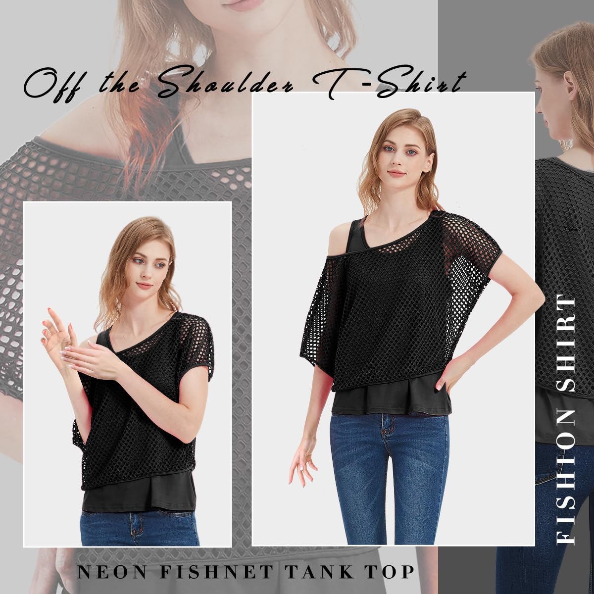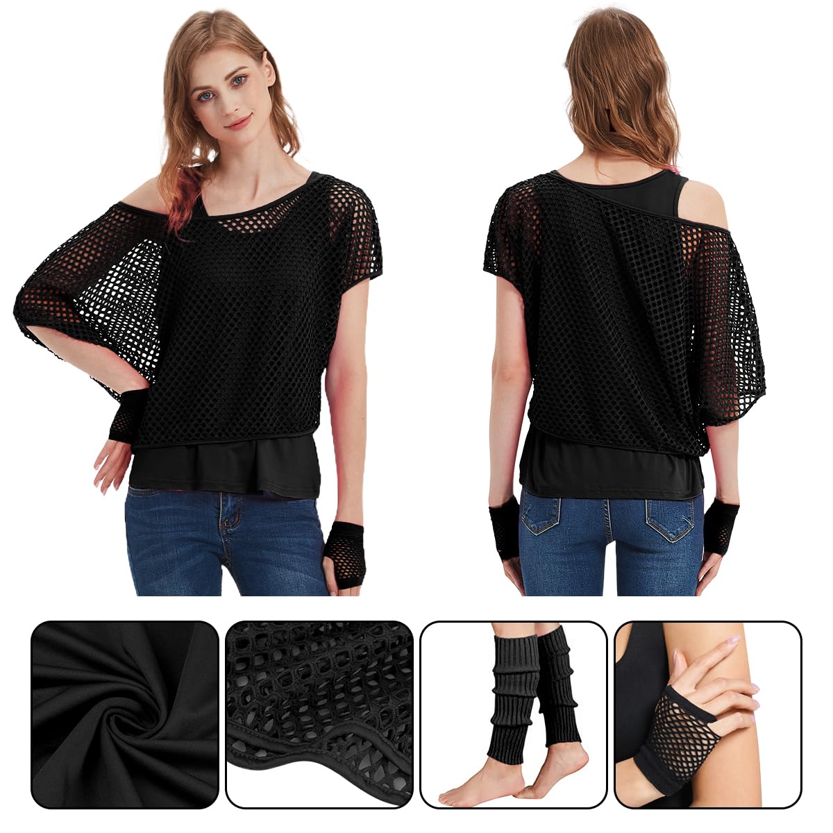 "💕[80s Women's Mesh Shirt Set with Tank Top]: Includes 5 types of accessories: 1x mesh top, 1x summer top, 1x pair of leg warmers, 2x fingerless long fishnet gloves, 2x fingerless short fishnet gloves. The retro feeling of the 80s and 90s will make you shine in the crowd. Our 80s mesh shirt set will meet the needs of your makeup party. It's a great costume for Halloween and carnival parties, stage performances, and birthday parties."
