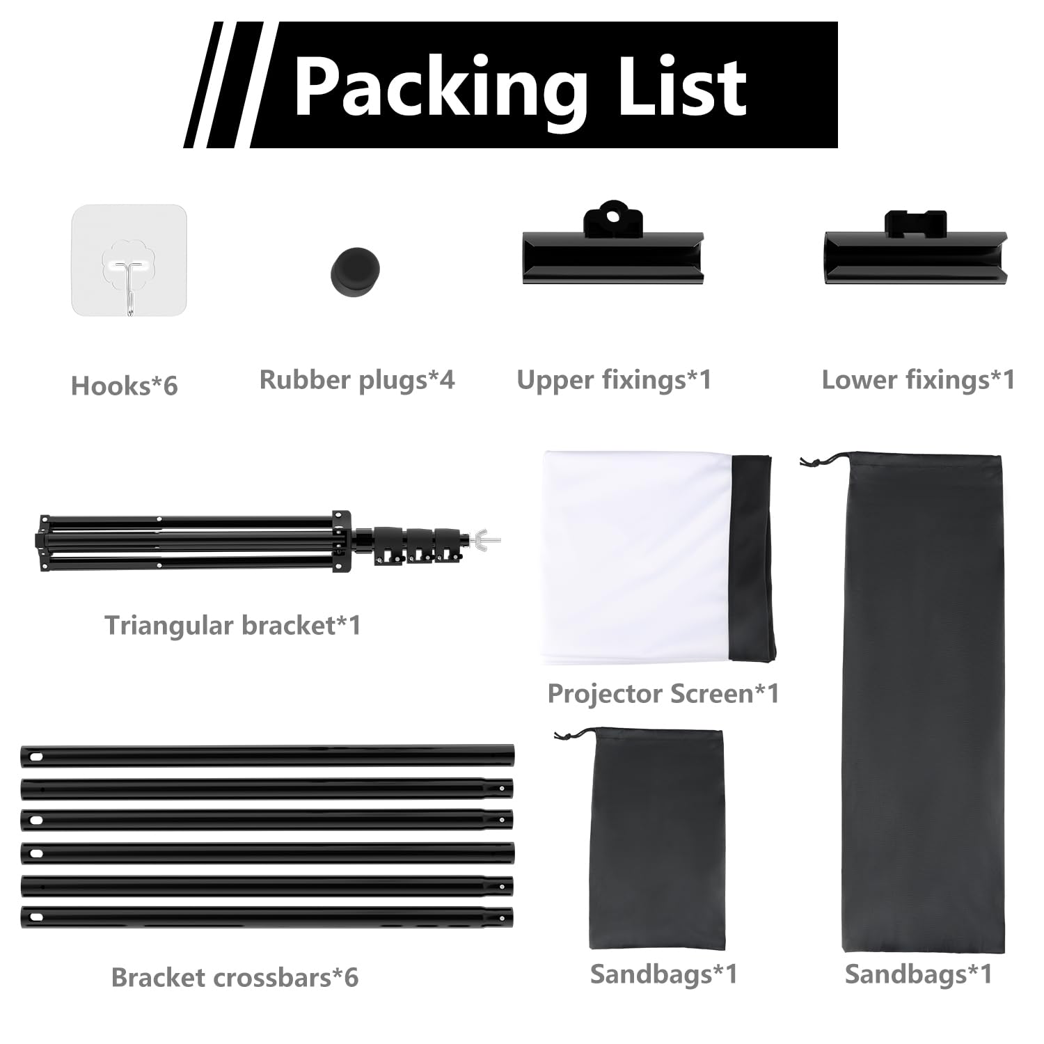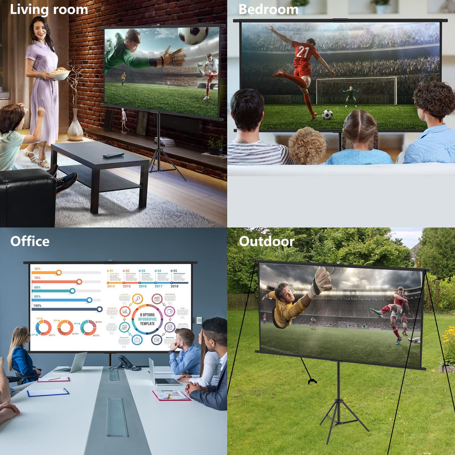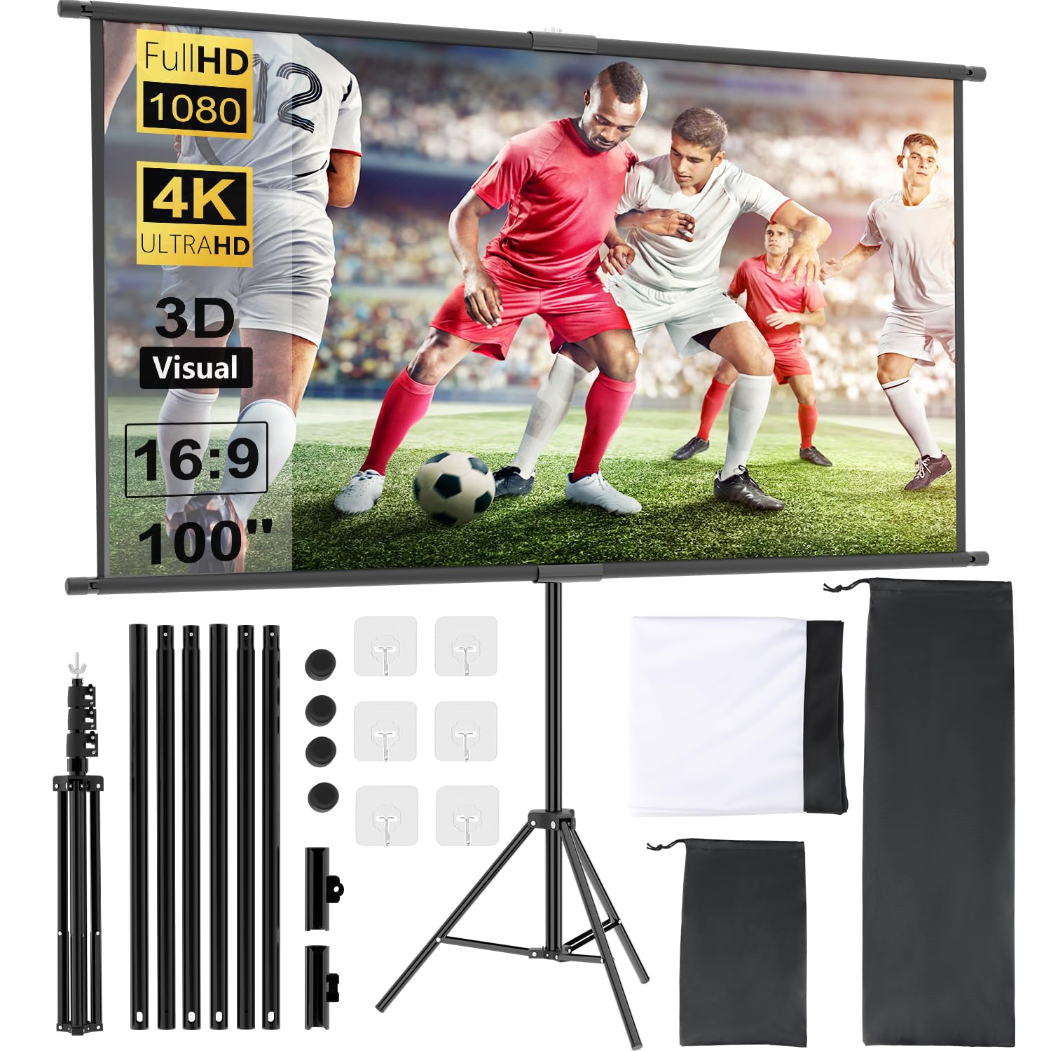 ["Projector Screen: 100-inch 16:9 HD 4K Ultra Wide screen with detailed colors for excellent viewing experience in various positions.",