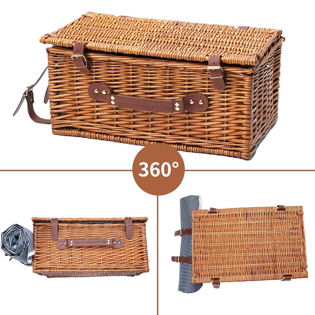 Willow picnic hamper for 4 with insulated cooler and waterproof blanket. Includes utensil set. Large willow picnic set for outdoor camping (Brown).