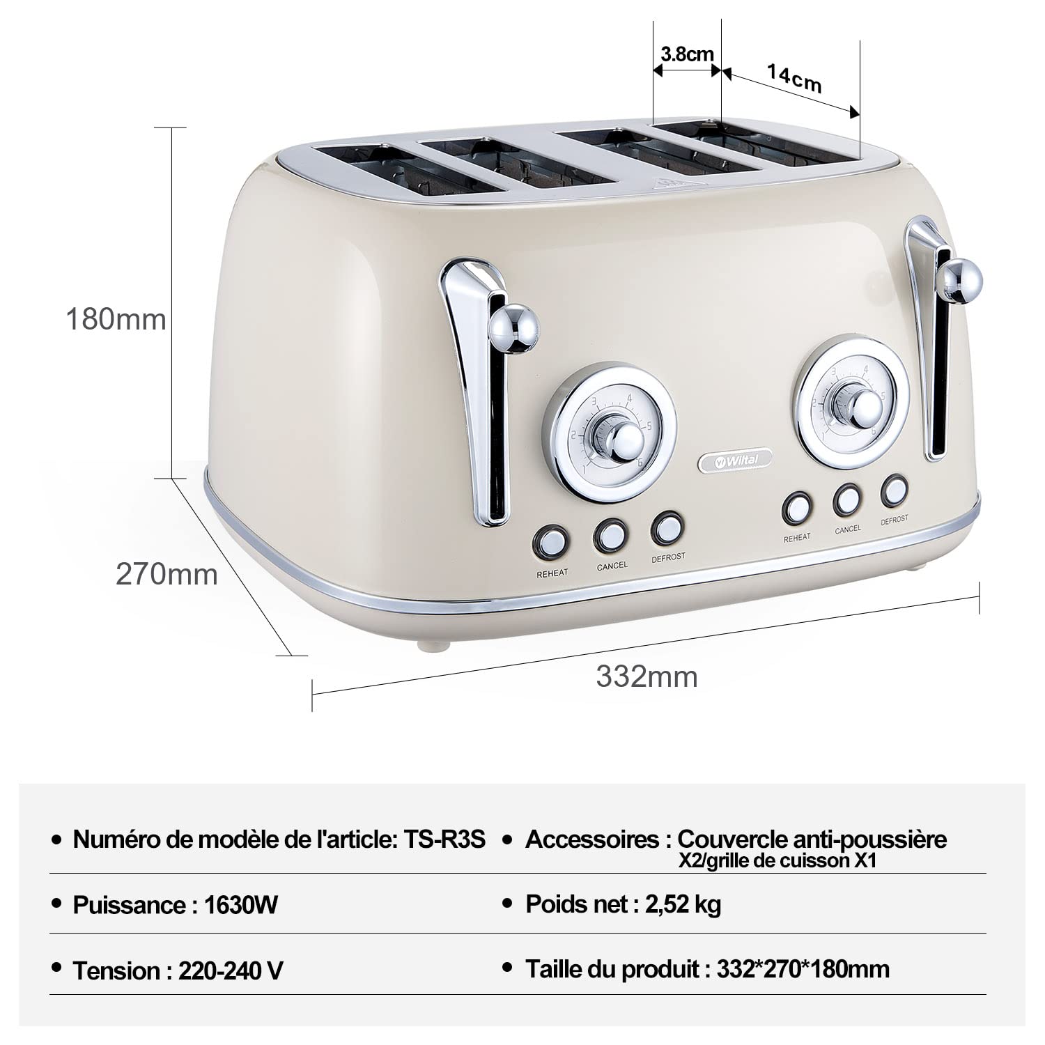 ["4-Slice Toaster: A toaster for the whole family. The TS-R3S Retro 4-Slice Toaster features four slots to quickly refill at the breakfast table and reduce waiting times. The left and right slots can be individually set for different levels of browning to suit different tastes.","4-Slice Toaster with Bun Warmer Usage: Whether it's between baguettes or bagels, rolls, croissants, large or thick/thin toasts, or a simple classic sandwich or thin toast. Frozen bread can be thawed directly in the unit using the "Defrost" button.","4-Slice Retro Toaster: a stylish retro look, available in green and cream, and a lovely addition to your home. With removable bread rack, crumb tray, dust cover, expand the range of use.","4-Slice Toaster: Due to the separate baking unit, this device is still energy efficient. 1-2 slices of toast only consume one unit. 6 levels of baking settings, you can choose different levels according to your taste. With convenient cable storage, separate release button with indicator light, rubber feet (non-slip), stable base.","Wiltal Retro Toaster is equipped with 4 widened toaster slots (3.8 cm x 14 cm x 14 cm) for toasting a variety of thin and thick breads. Solid structure and reliable quality. Enjoy a delicious breakfast at home with toast, sliced bread, sandwich slices, waffles, and more."]