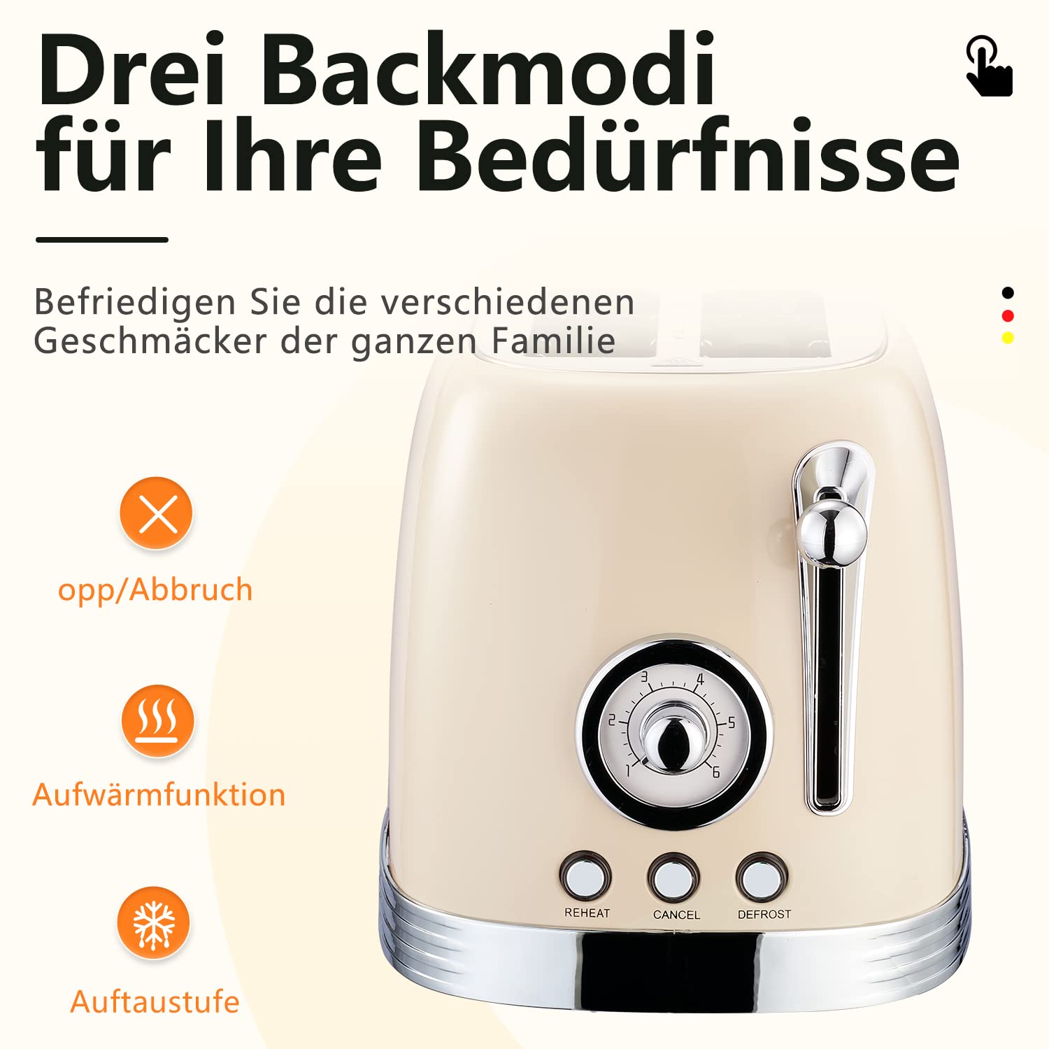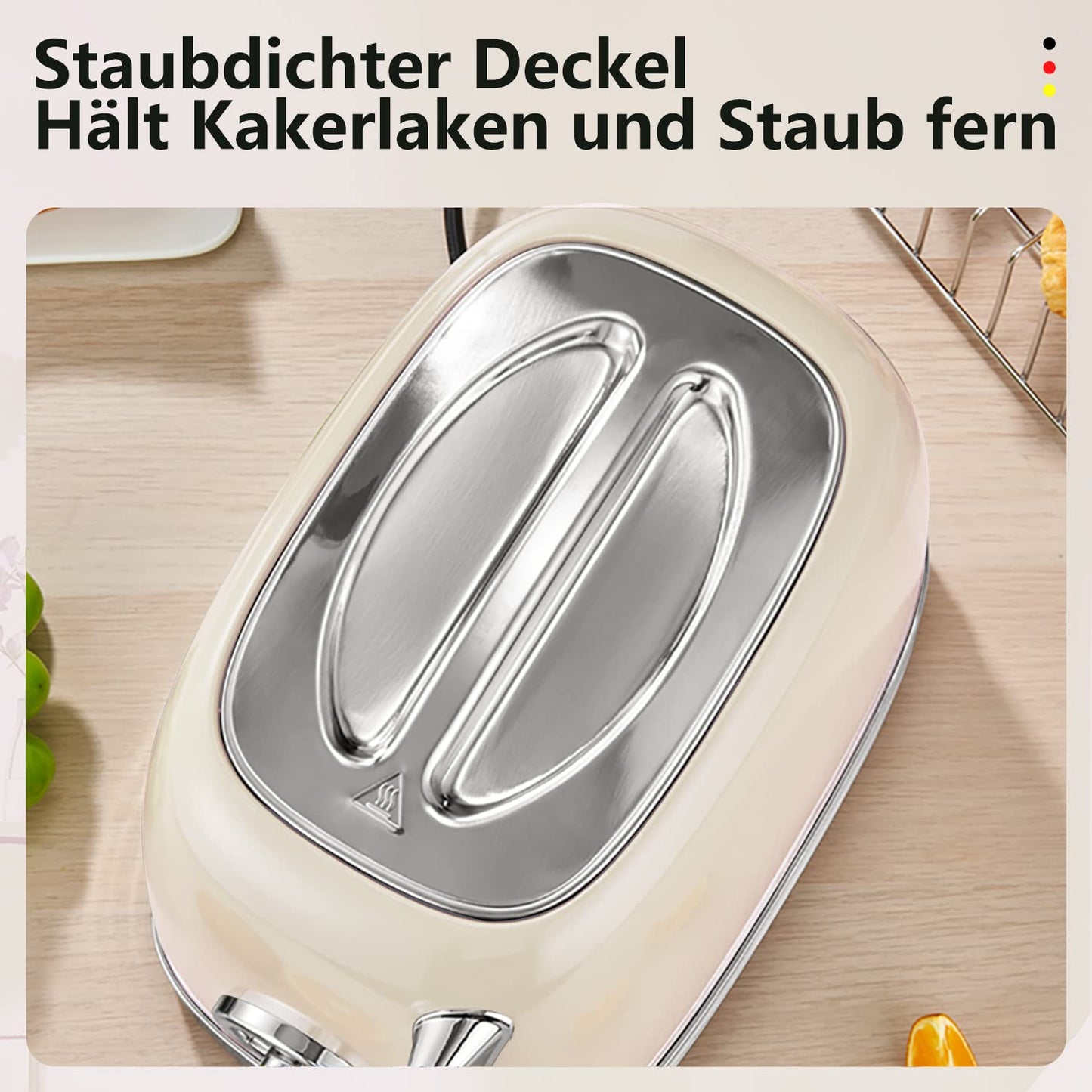 Wiltal Toaster 2 slices, retro design, with bun rack, stainless steel lid, preheat, defrost, cancel functions, countdown timer display, Quick-Toaster (cream)