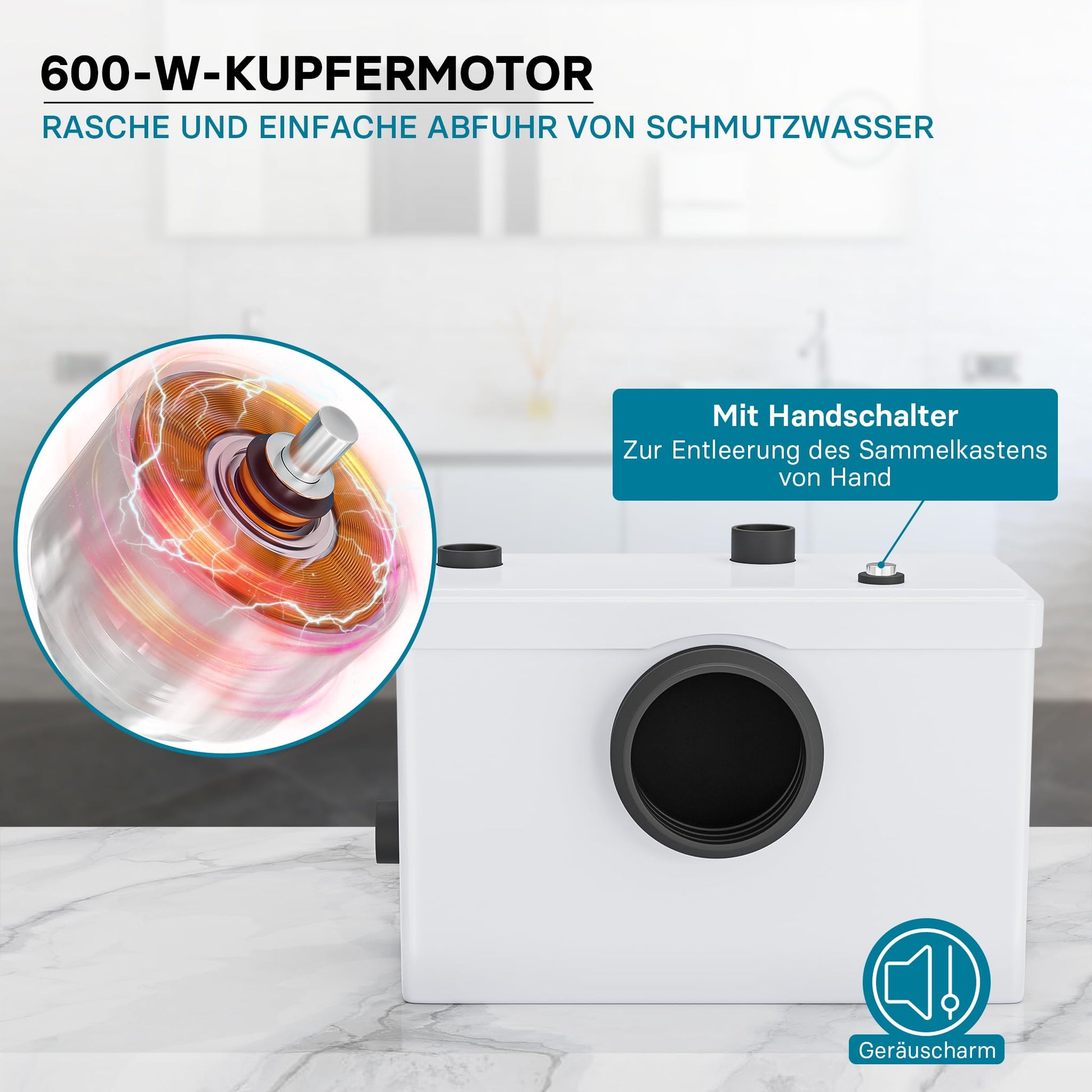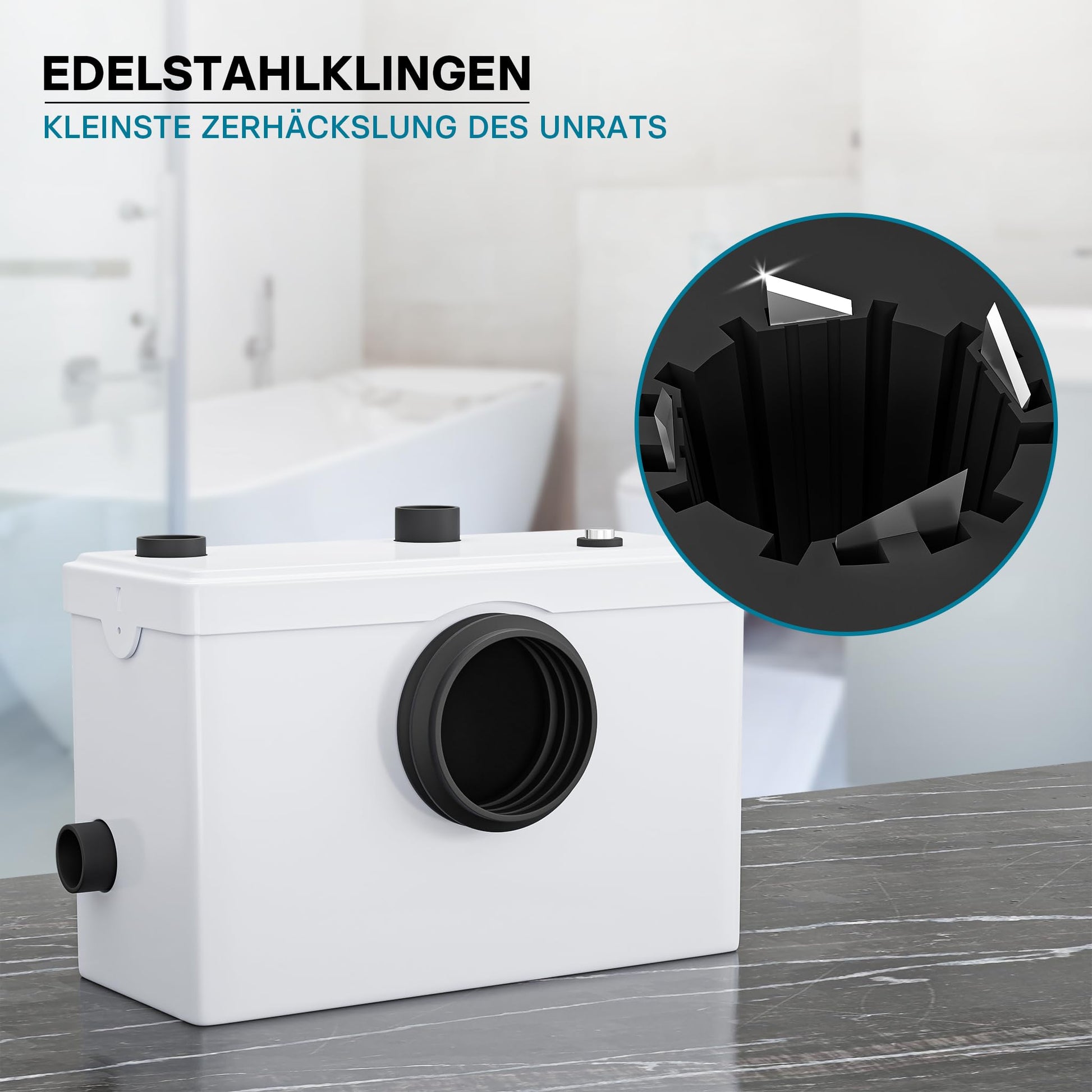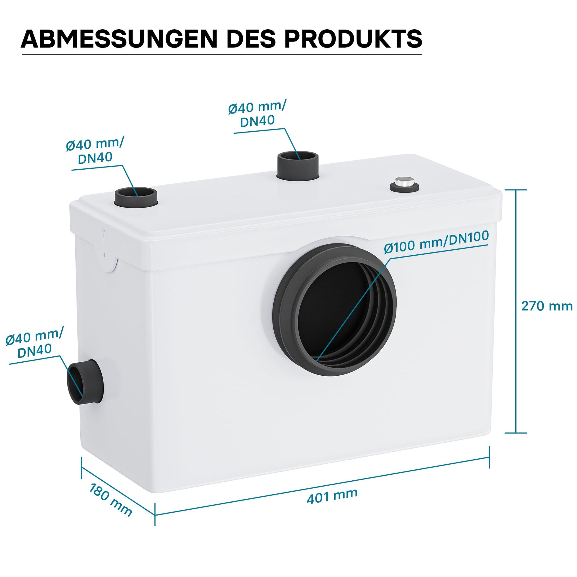 ["Versatile connection options] - Provides three flexible inlets for easy integration into existing wastewater systems. Inlets 1 x toilet connection DN100 and 2x DN40.","[Robust pumping performance] - Powerful enough to pump up to 200 liters of wastewater per minute, even at high temperatures up to 90 °C and a lift height of up to 10 meters.","[Automatic operation] - The pump activates itself automatically when the water level in the collection tank reaches a certain level and shuts off after emptying to save energy.","[Quiet and low-maintenance operation] - Easy-to-maintain system that only needs occasional decalcification, providing reliable and efficient wastewater disposal with minimal noise pollution.","[Efficient solid waste shredding] - The lifting system is equipped with a mechanism that effectively shreds solid components in wastewater before they are transported away."]