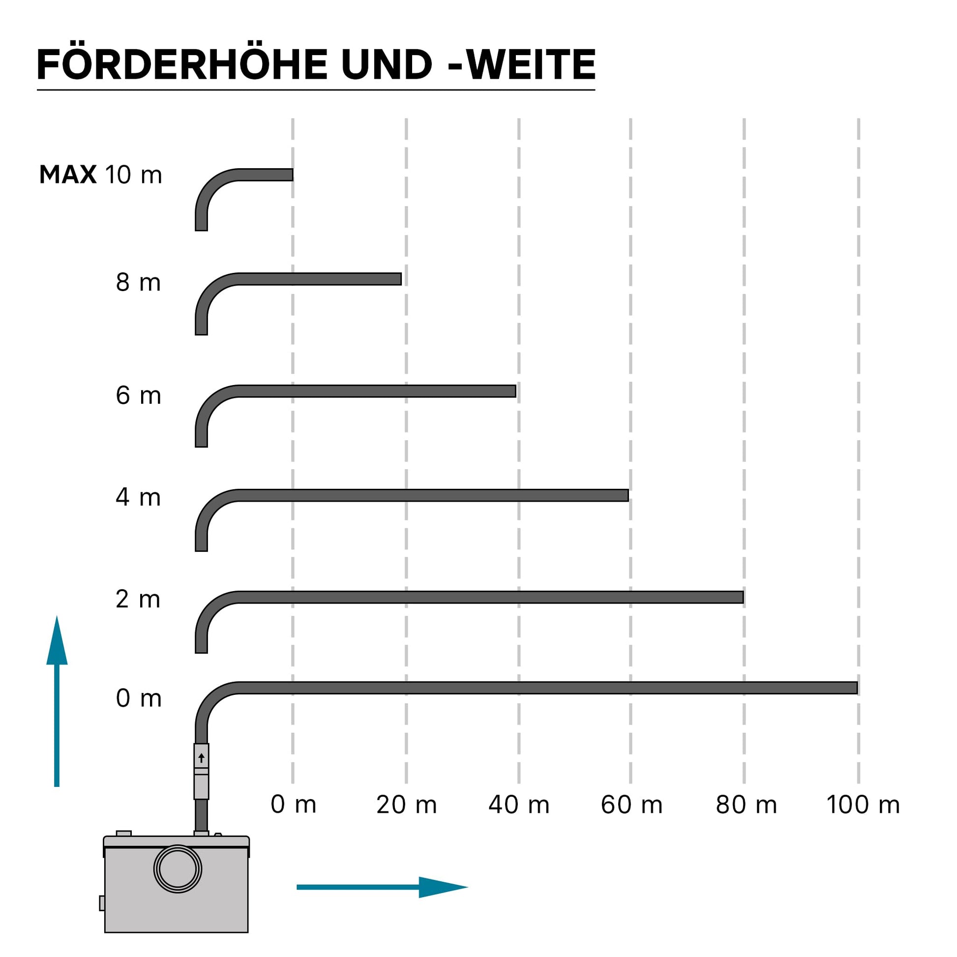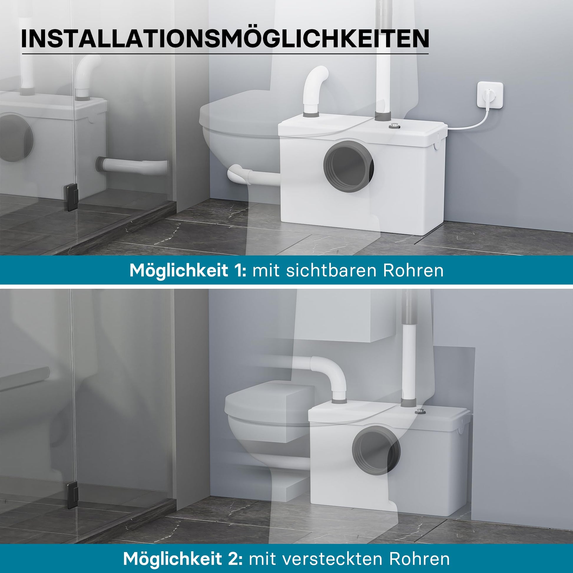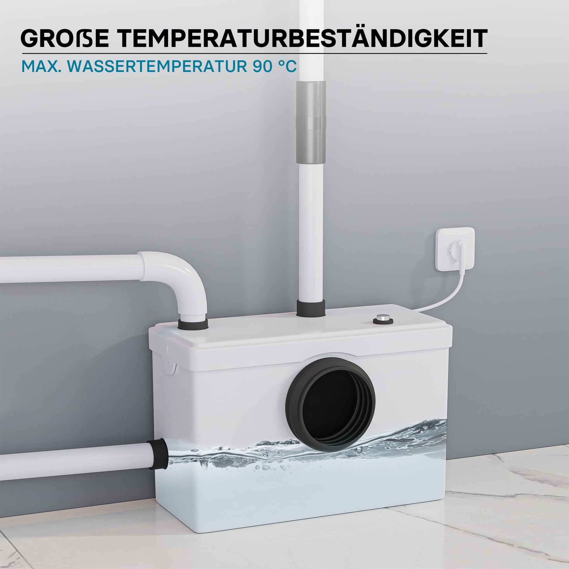 ["Versatile connection options] - Provides three flexible inlets for easy integration into existing wastewater systems. Inlets 1 x toilet connection DN100 and 2x DN40.","[Robust pumping performance] - Powerful enough to pump up to 200 liters of wastewater per minute, even at high temperatures up to 90 °C and a lift height of up to 10 meters.","[Automatic operation] - The pump activates itself automatically when the water level in the collection tank reaches a certain level and shuts off after emptying to save energy.","[Quiet and low-maintenance operation] - Easy-to-maintain system that only needs occasional decalcification, providing reliable and efficient wastewater disposal with minimal noise pollution.","[Efficient solid waste shredding] - The lifting system is equipped with a mechanism that effectively shreds solid components in wastewater before they are transported away."]