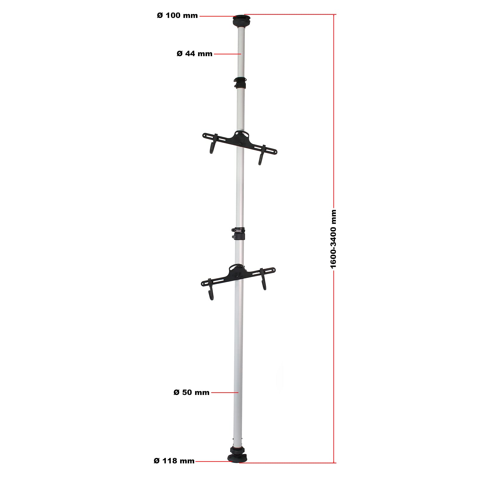 ["Space-saving design - The telescopic bike rack for hanging storage of two bikes efficiently uses vertical space, making it ideal for small spaces like garages and basements","Adjustable telescopic pole - The pole can be adjusted between 160 and 340 cm, fitting in almost any room with standard ceiling height. Rubber caps provide a secure grip","Rotatable and adjustable holding arms - The holding arms can rotate 360° and be adjusted in height and angle, allowing for flexible customization. Load capacity per arm is 20 kg, total 40 kg","Variable adjustable hooks - The holding hooks are suitable for bike frames up to 50 mm in diameter, providing secure support and can be individually adjusted","Easy installation without drilling - The uncomplicated installation of the sturdy aluminum frame is done without drilling, with included mounting material for secure attachment"]