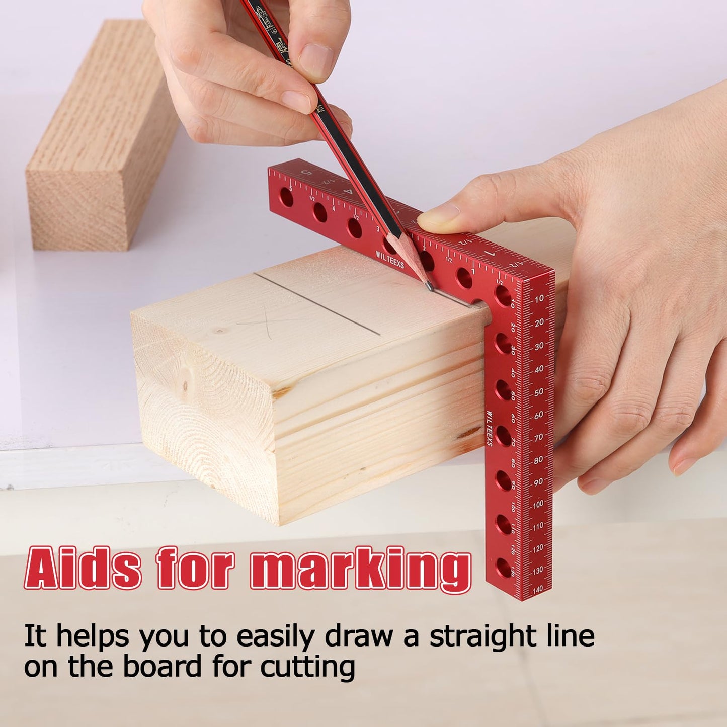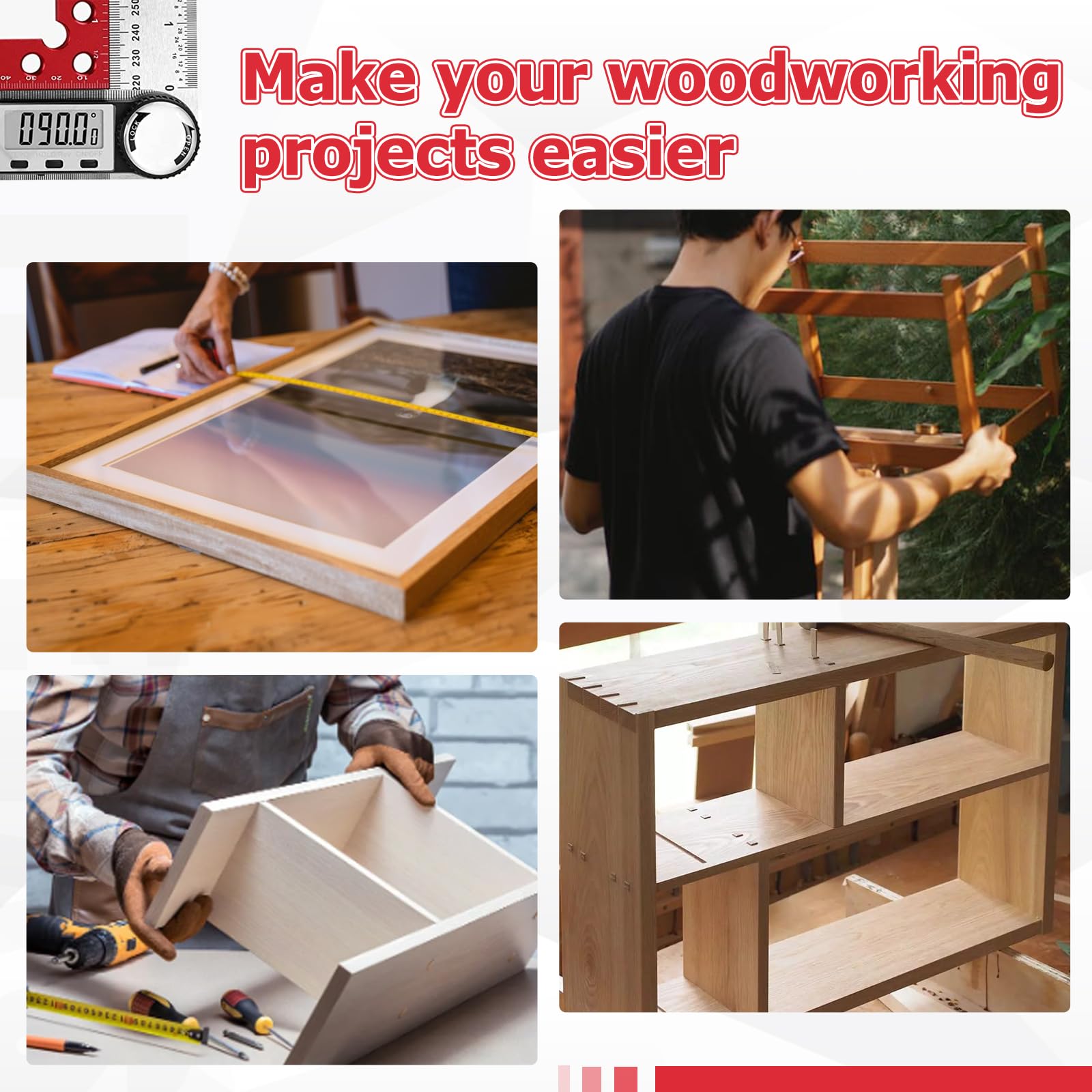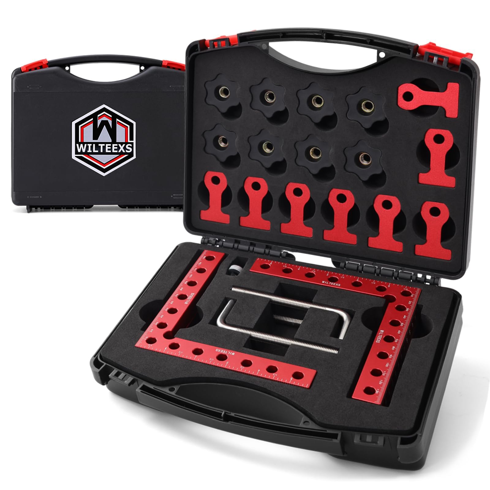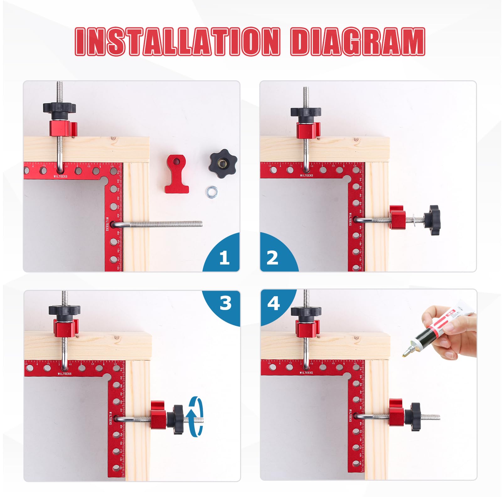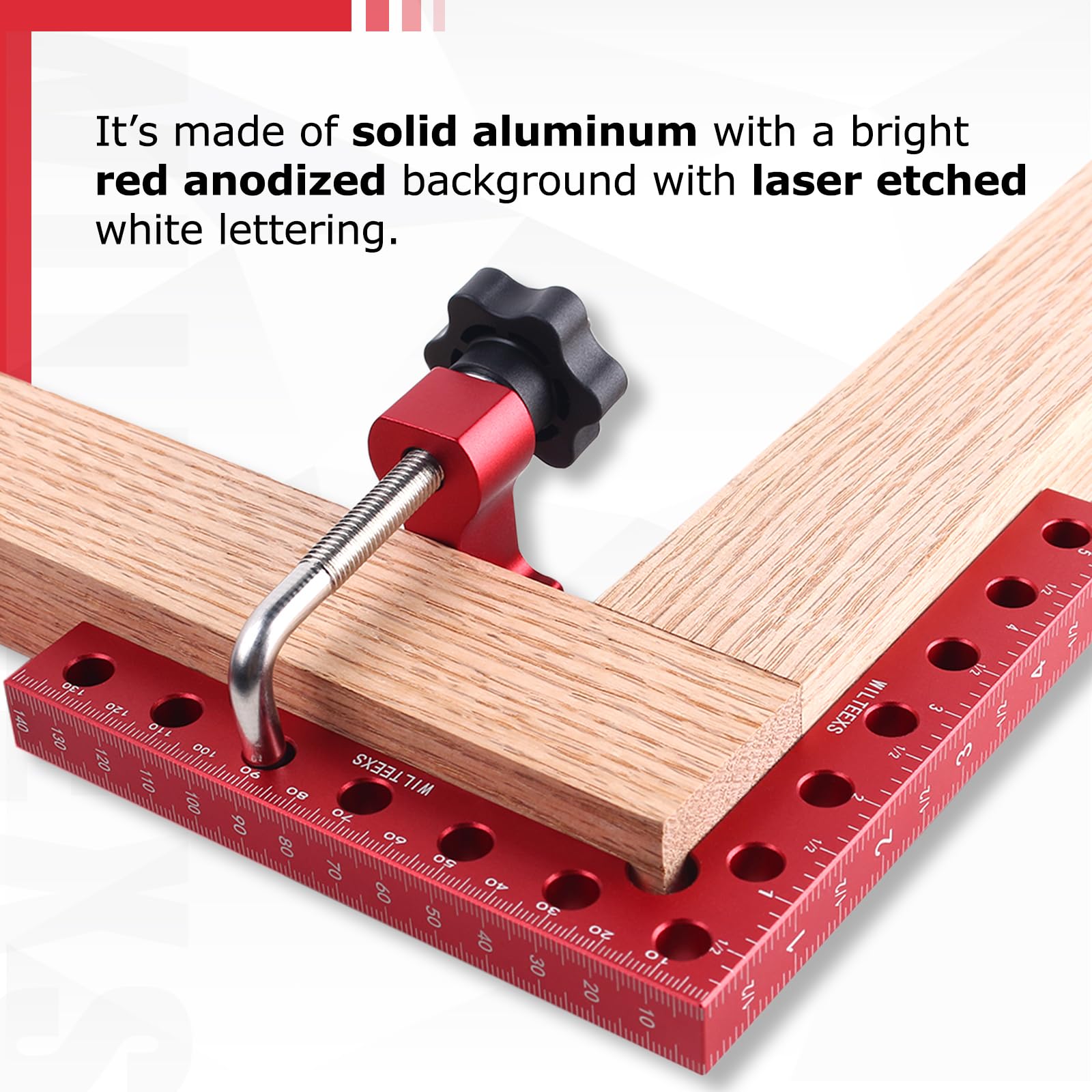 ["High-quality Material: This 5.5 x 5.5 inch right angle clamp is made of anodized and machined aluminum alloy, providing optimal durability and use. The corner clamps are a breeze and ideal for small frame or carpentry projects, capable of holding up to 2.75 inches thick, more durable than plastic clamps for long-term use.","Accurate 90-degree corner clamps: The L-shaped design allows wood clamps to create perfect 90-degree angles, resulting in clean and seamless joints. The solid construction ensures the clamp acts as an extra set of hands, holding your materials in place while you cut, drill, or sand, enabling precise and controlled assembly.","Dual-scale display: Clear and accurate inch and millimeter scales on the front and back of the clamp make it a versatile measuring tool, eliminating the need for a separate ruler. Another feature they offer is keeping the line and drawing a straight line on the board for cutting, making it very easy to make markings.","Padded box included: These 90-degree clamps come in a neat and organized case to ensure you don't spend half the day chasing the right clamp and to keep parts away from dust and dirt. This makes it a great tool and a great gift choice for professionals who need to take their clamp on the go, as well as for DIYers who need to keep their workshop organized.","Application: Position the corner clamp inside or outside the wood and insert the screw clamps into the holes, tightening them on the opposite side. Depending on the project size, you may need to use multiple clamps."]