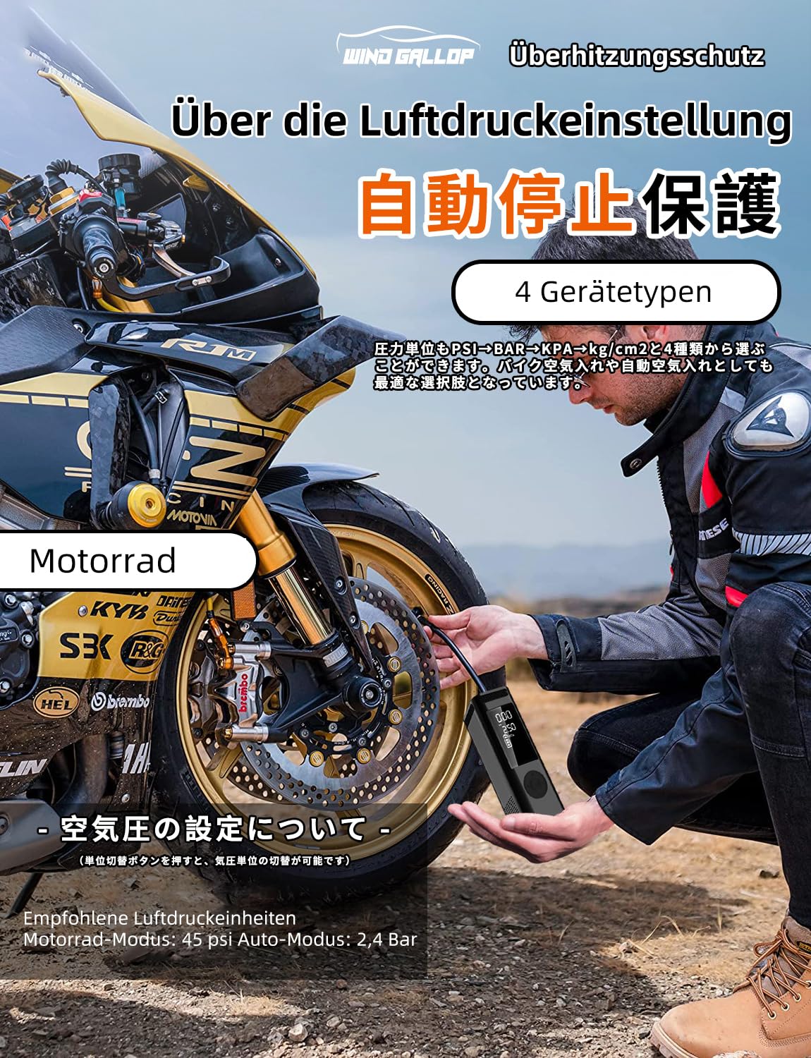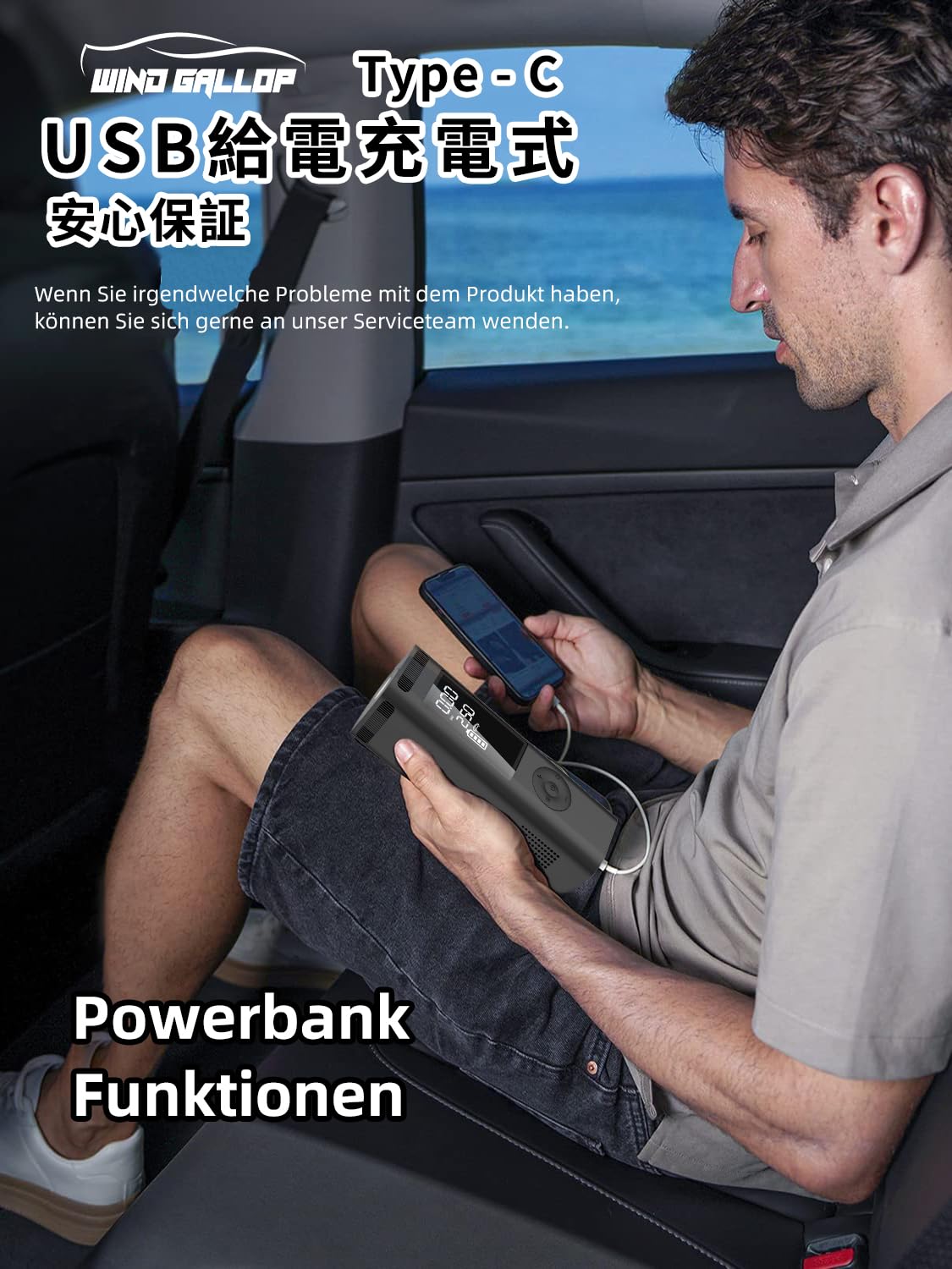 ["【STABIL AND LONG-LASTING】: We have made this car tire inflator from durable ABS plastic and a strong stainless steel turbocharger. You will feel the good quality and compact design of our product when you open and touch the packaging. It is a great choice to send it as a Christmas or birthday gift.","【MULTIFUNCTIONAL SMART AIR PUMP】: Portable and sturdy electronic smart car air pump. It can be used to inflate car tires, bike tires, balloons, inflatable toys, swim rings, etc. It can also be used as a portable 6000mAh power bank charger with rechargeable Type-C battery for charging mobile phones or pads. It has a very bright LED light for easy use at night and can also be used as a flashlight. Presta valve adapters allow for inflating bike tires with French air nozzles.","【EASY TO USE】: Simply attach the hose to the nozzle of the tire you want to inflate. You can switch between modes for car, motorcycle, bike, and basketball with the push of a button, and then inflate these items directly. There is a clear digital display for the current PSI and a mode switch to switch between different units of measurement (bar, kpa, psi, kg/cm2). It automatically shuts off when the preset pressure value is reached. It takes less time and is less laborious than a foot pump.","【FAST INFLATION】: This electric car compressor uses the original unique turbo motion, which is more powerful, quieter, and more stable. It can inflate the 195/65R15 car tire from 0 to 35 psi in 5 minutes, making emergency tire inflation faster, easier, and more convenient than hand pumps or foot pumps.","【WARRANTY, CUSTOMER SERVICE, AND NOTES】: WindGallop assures you that we will provide you with a new replacement or a full refund under normal use. Notes: 1. Please follow the instructions. 2. Make sure it is securely attached to the tire and the air hose is not bent before operation. 3. Not suitable for the tires of large trucks, other vehicles with high-pressure tires, and large volumes such as inflatable canoes. 4. If it works for 10 minutes, let it rest for 10 minutes before using it again." ]