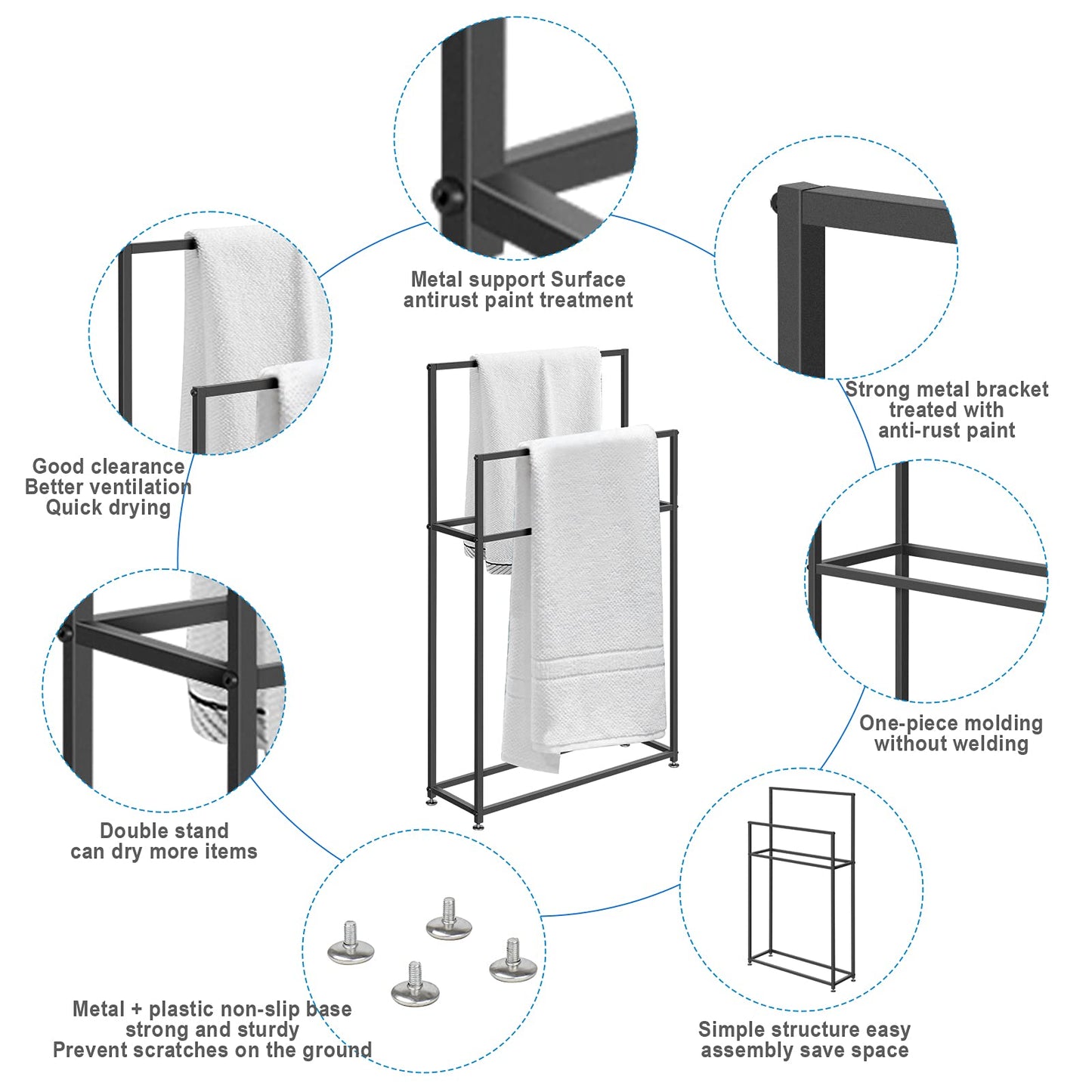 ["FREESTANDING TOWEL HOLDER: Towel rack with 2 bars for hanging and drying towels with ease. Also suitable for use in laundry rooms or kitchens to keep towels within reach.","HEAVY DUTY & DURABILITY: Iron metal material with black coating, waterproof, rust and corrosion resistant, ensuring quality and longevity.","MULTI-PURPOSE: Portable towel stand, for hanging clothes, towels, rags, socks, etc., providing additional storage space for towels.","EASY TO USE: No assembly required. Simply place the rack where needed.","IDEAL SIZE: The towel holder is 110 cm tall, available in 3 sizes. Clean lines, elegant black finish, creating a modern look as a complement to contemporary decors."]