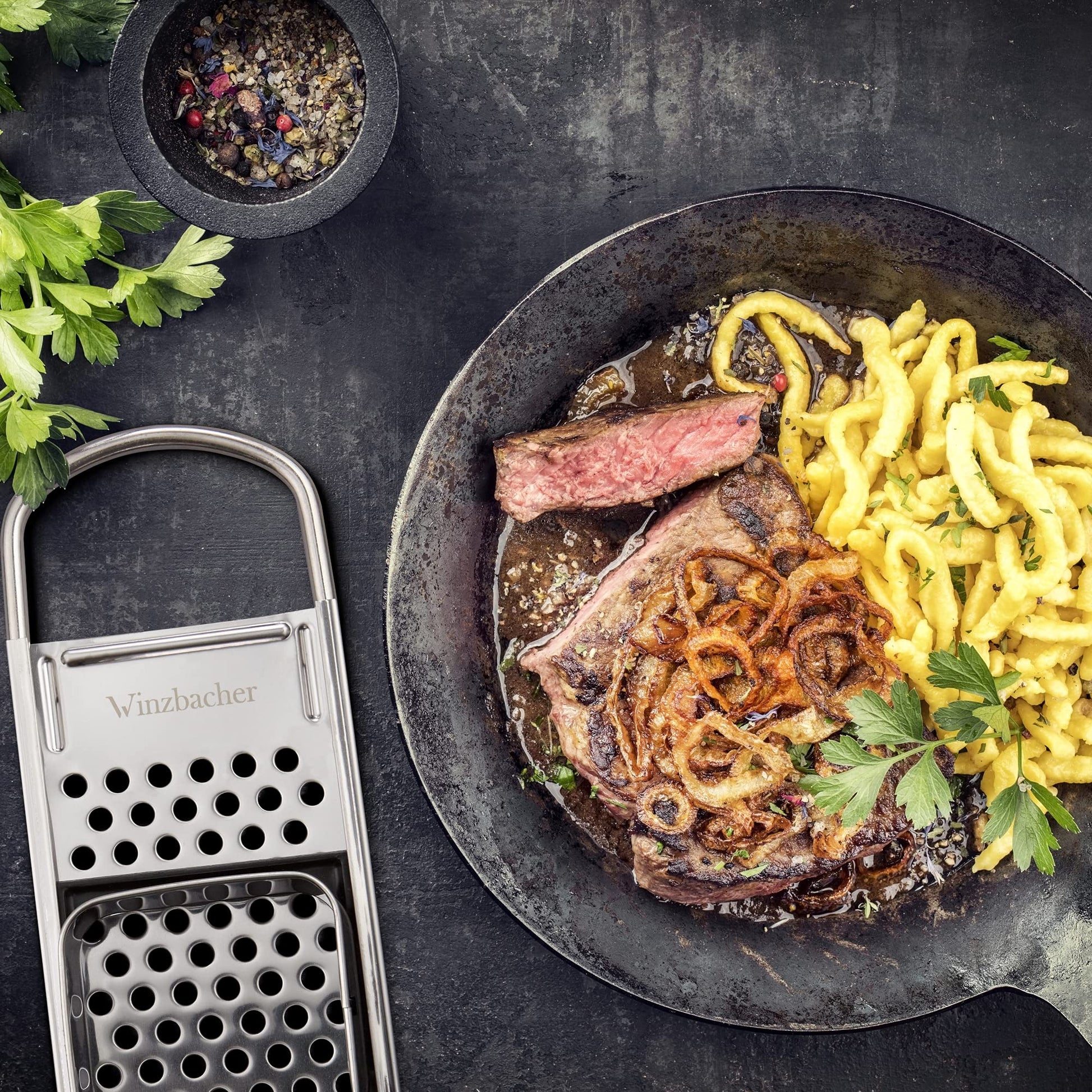 ["✅ SPITZENQUALITÄT - The Winzbacher spätzle slicer is made of 100% stainless steel. To avoid scratches during use, the bottom part of the slider is made of BPA-free hard plastic, making it tasteless and durable.","✅ EASY & CONVENIENT - Ideal kitchen tool for making homemade fresh spätzle and knöpfle. With just a few simple steps, you can prepare a great dish for family and friends. Find a recipe on our packaging.","✅ FOR ALL POTS - Due to a length of 33cm, our spätzle grater is suitable for all conventional pots. Thanks to the hook at the end of the grater, you have a secure grip while slicing.","✅ EASY TO CLEAN - Our slicers are practical and easy to clean. Simply rinse under running water after use or effortlessly clean in the dishwasher.","✅ 100% SATISFACTION GUARANTEED - If you don't love our product, simply return it within 60 days and we'll refund the full amount - no questions asked!"]