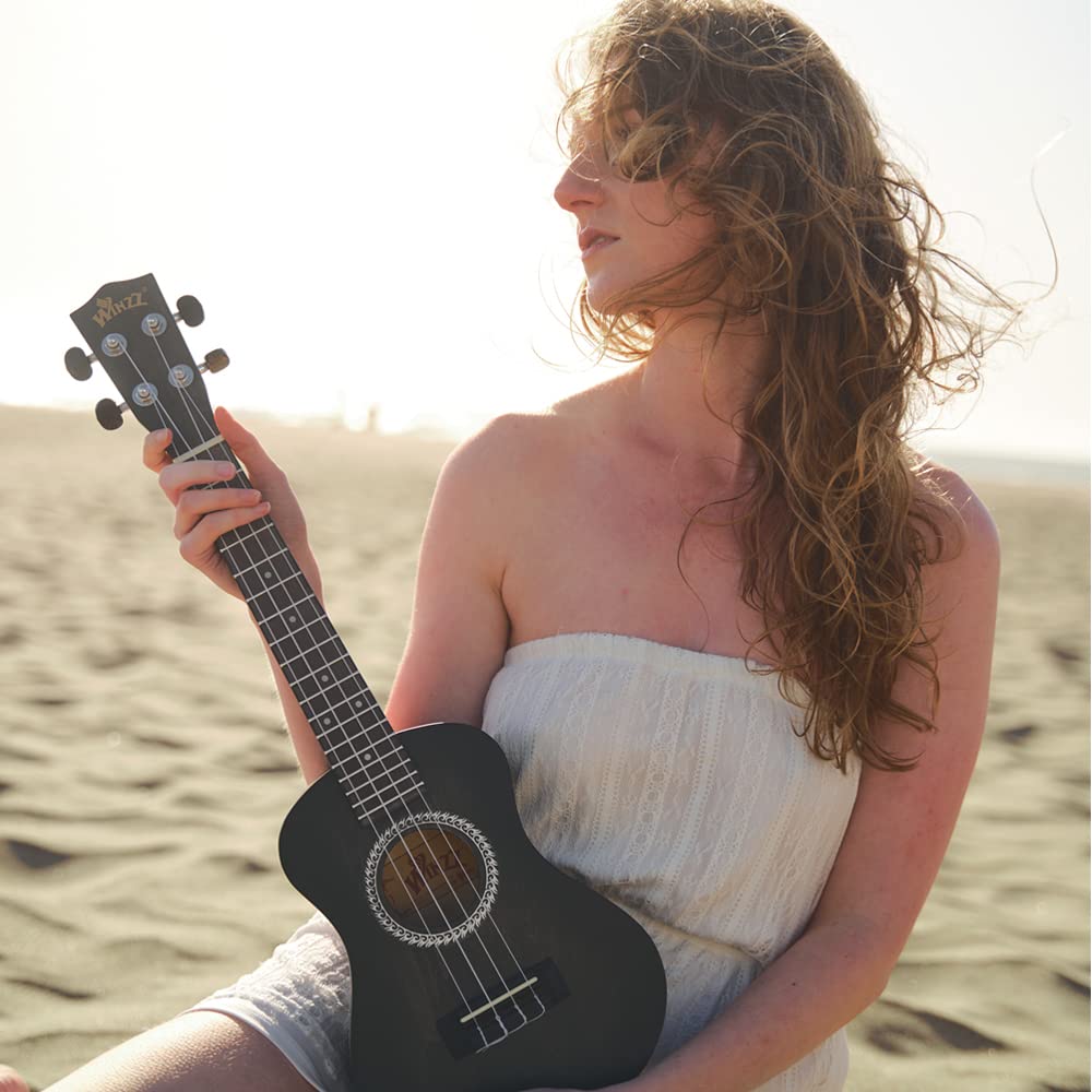 Winzz 23" Ukulele Concert Beginner Set for Kids Adults, Unique Color Design, with Bag, Tuner, Extra Strings, Strap, Music Note Stickers (Black)