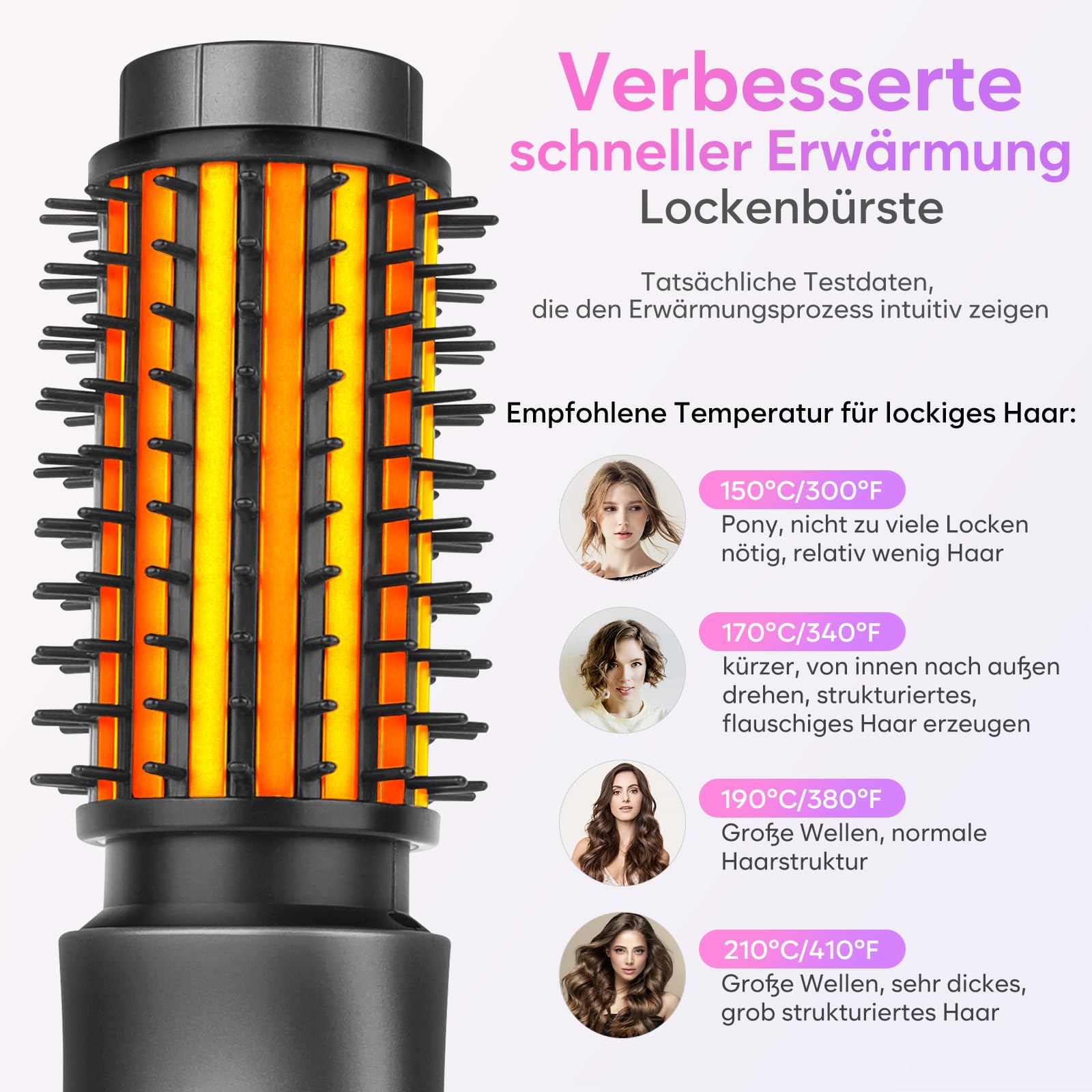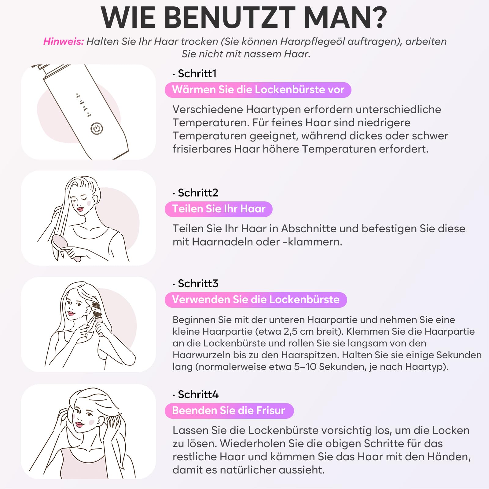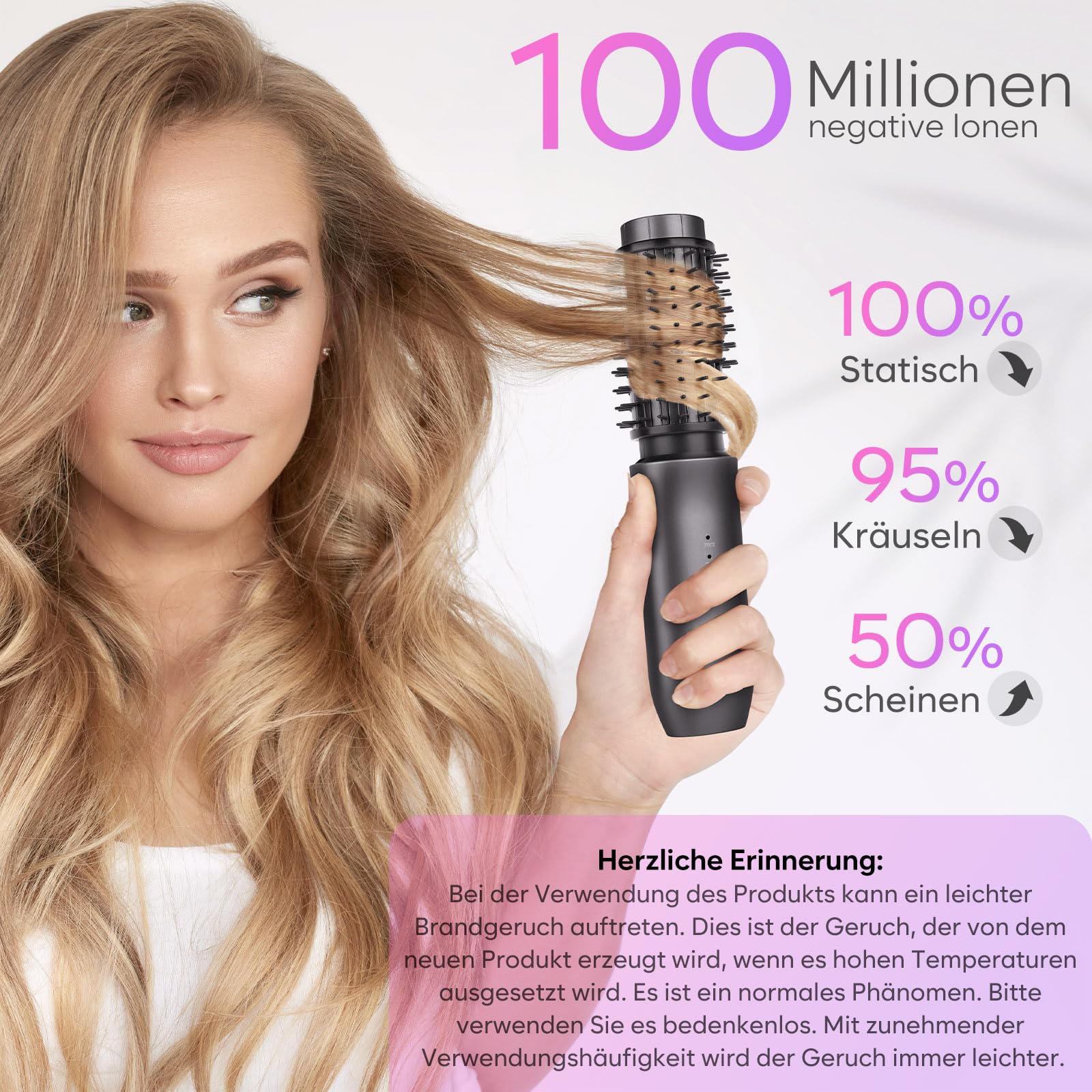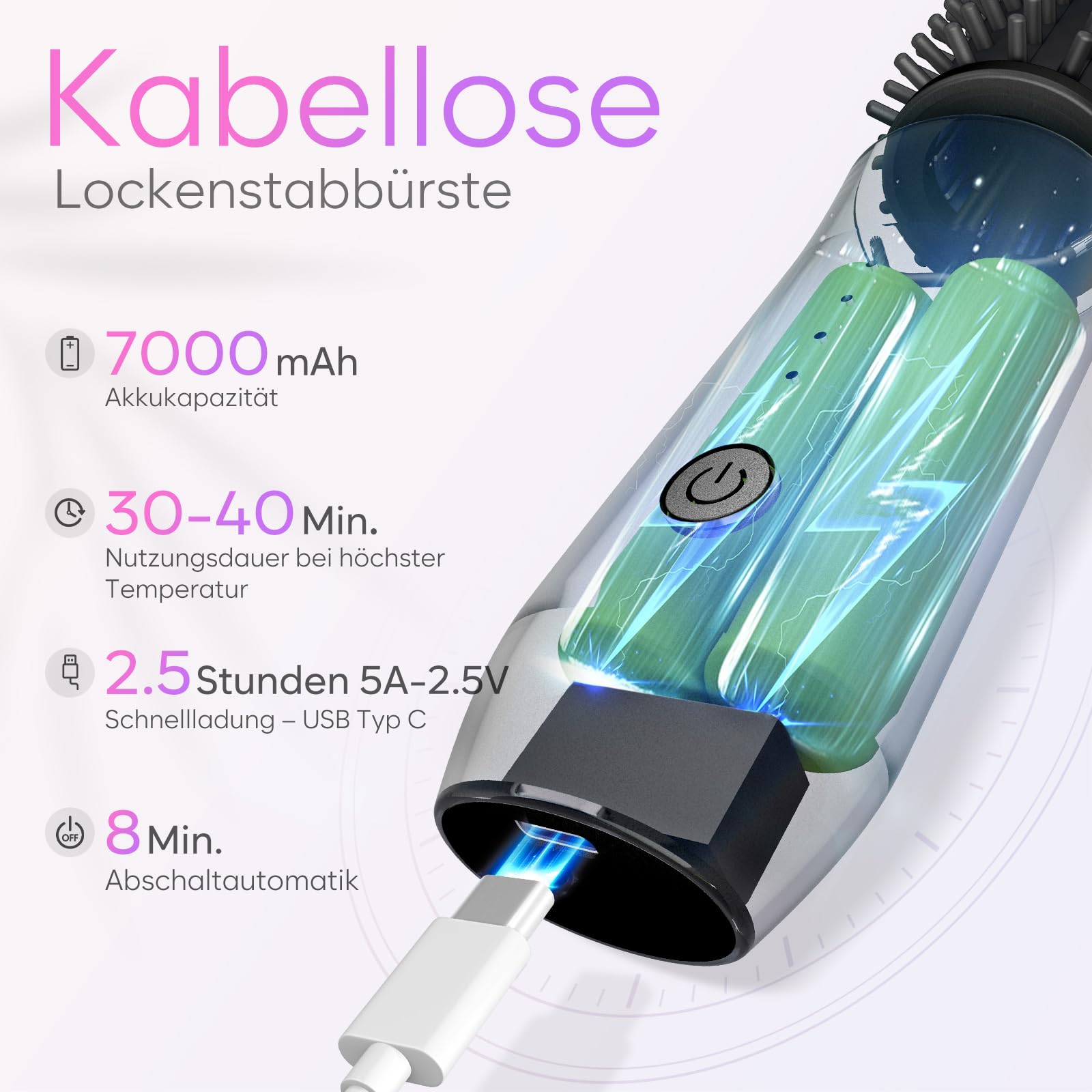 ["Wireless and portable: This wireless curling brush features a cordless design, making it compact and easy to carry. It works without a socket, allowing you to conveniently style your hair on the go.","Quick heating in 30 seconds: The advanced heating technology allows the curling brush to heat up quickly. It can reach a relatively high temperature in 30 seconds. Avoid touching it with your hands to prevent burns. However, to achieve a better shaping effect, you should patiently wait for the temperature to reach the set temperature before use.","High-capacity battery: With a built-in high-capacity battery of 7000 mAh, a full charge can be used for about 30 minutes. This is especially convenient for when you're on the go.","Hair care with negative ions: Equipped with ion technology, this curling brush releases negative ions during use, which can help reduce static charge and frizz, potentially protect your hair, and make it smoother and shinier.","Four temperature settings: With four adjustable temperature settings, this wireless curling brush adapts to different hair types and styling needs, giving you the flexibility to create your desired hairstyle."]