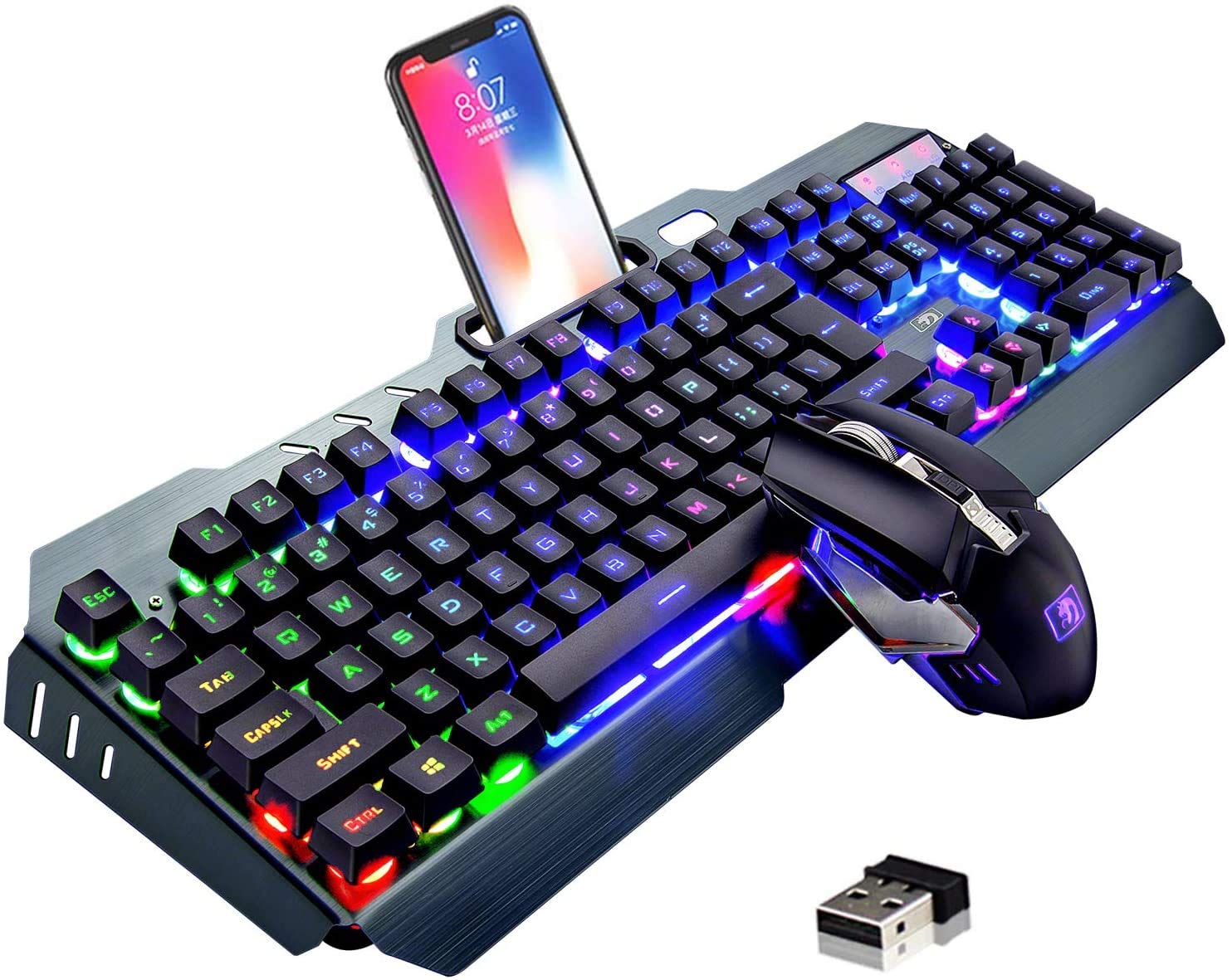 ["【2.4G Wireless Technology】The wireless gaming keyboard and mouse device are simply plug and play using advanced 2.4G wireless technology. They share a USB receiver (the USB receiver is located under the back of the mouse). When in use, simply plug the USB receiver into the device without installing any software. Note: After connecting, make sure the keyboard and mouse switches are turned on.","【3800mAh Large Capacity Battery】The rechargeable keyboard and mouse set have a built-in large capacity rechargeable battery (keyboard: 3000mAh, mouse: 800mAh). The large capacity battery can ensure long battery life, reduce charging frequency, and the power saving setting automatically puts the keyboard into sleep mode after 3 minutes without operation, press any key to wake it up.","Rainbow Backlight Effect: The cool rainbow backlight effect provides a visual feast at night. FN+DEL switches between three backlight states (normal-breathing-off), easy operation. You can also adjust the brightness of the backlight and the breathing effect frequency to better meet your keyboard requirements.","Unique Stand Design: The keyboard is made of durable, brushed aluminum alloy, dual-color injection keycap, non-slip design, splash-proof and durable. It features a variety of multimedia key combinations to quickly control every function. The ergonomic keyboard is equipped with a phone and lighter stand. This special phone holder design can perfectly solve the problem of placing the phone during the game.","Wireless Backlit Mouse: The gaming mouse features specially designed buttons to improve durability and tactile feedback, and the key life can reach 60 million times. It has a unique metal scroll, 7 types of intelligent colorful breathing lights, 6-button keys and wings with advanced galvanic technology, unique and stylish. It also has an adjustable 4-speed DPI (800-1200-1600-2400), accurate positioning, good touch and game feel."]