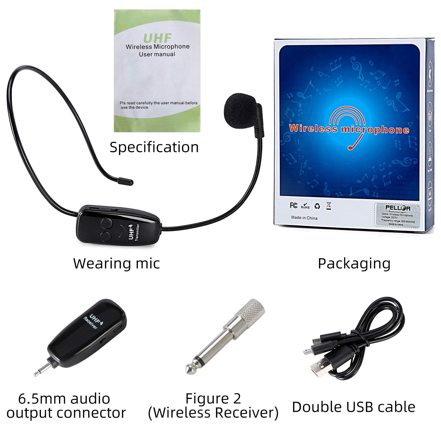 ["UHF Microphone: Integrated high-sensitive condenser microphone, stable signal, no delay, anti-interference, transmission distance of up to 50M (160 feet). Note: Only applicable to the microphone jack and cannot be independently amplified","Easy to use: Turn on the power switch of the transmitter and receiver, the blue light flashes for about 2 seconds, the indicator stops flashing after successful pairing, and then you can use them without further operation. Headband and portable 2-in-1 design, small size, easy to carry","Rechargeable: Built-in rechargeable lithium-ion battery, providing approximately 8 hours of operation time. Equipped with a USB cable, fully charged for 3-4 hours","Wireless microphone: Our wireless microphones use digital wireless technology, and each transmitter and receiver undergo strict testing and quality inspections","Widely used: The receiver has a 3.5mm plug and an additional 6.35mm adapter. It can be widely used in voice amplifiers, high-power speakers, such as stage speakers, media classroom speakers, bus speakers, trolley speakers, and more"]