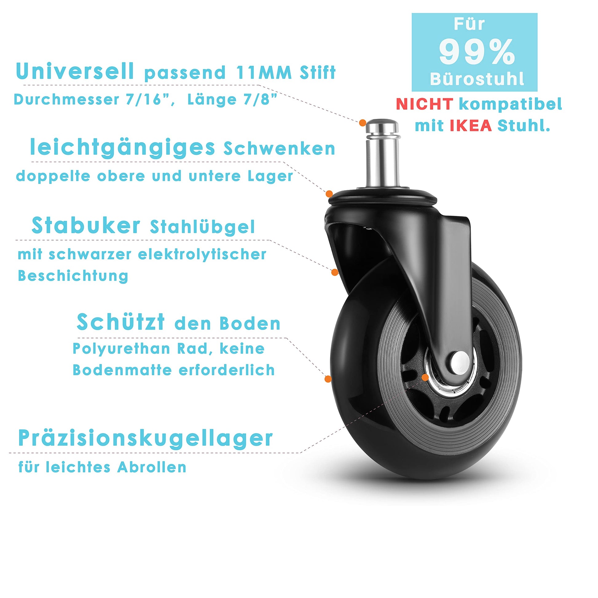 "[Fits most office chairs]: Stem: 7/16\"(11mm)*7/8\"(22mm) (Diameter * Length) fits most office chairs sold in Germany (Not compatible with 1KEA chairs). Supports weight up to 386 lbs. The difference between 10mm and 11mm is very small, so you need to carefully measure the dimensions of your office chair to avoid problems.