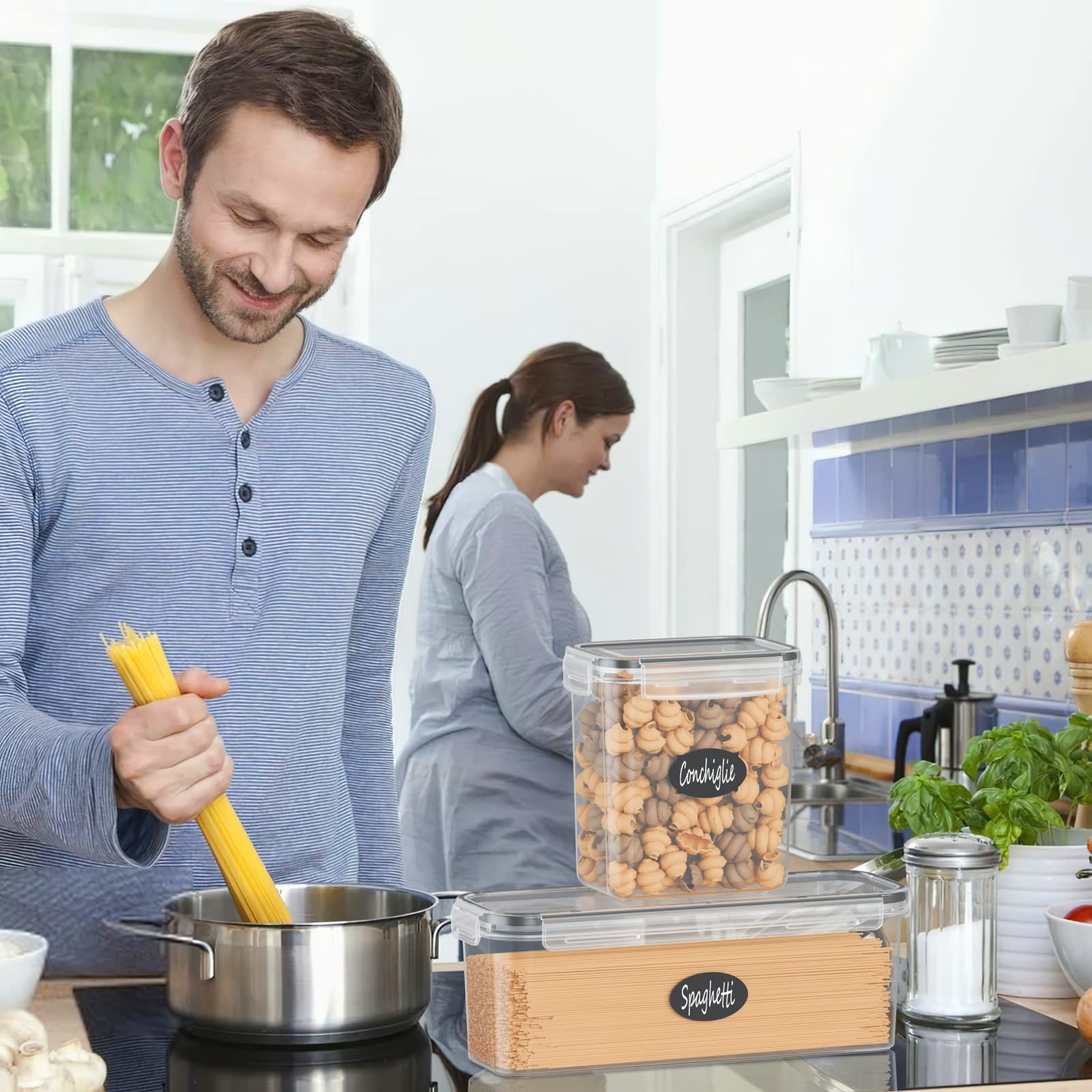 ["6 Food Containers】Includes 2.3L (4 PCS), 1.6L (2 PCS), comes with 16 usable labels for marking stored foods, 1 pen, and 4 measuring spoons.","【Durable Plastic】The plastic kitchen storage canisters use food-grade ABS plastic with high impact resistance, BPA-free and non-toxic. Easy to clean, dishwasher and fridge safe. Hands-free!","【Keep Food Fresh】The lid with a silicone ring creates a moisture-resistant airtight environment to keep food fresh and dry. Leak-proof and NO more moths!","【Well Organized】Our kitchen pasta containers can be stacked to save space and keep the kitchen or cabinet tidy. Eye-catching labels can help you recognize and access foods faster.","【Multi-Purpose Containers】Pasta containers can be used to store cereals, flour, fruits, oats, pet food, and more. Placed in cabinets and anywhere you want, making more efficient use of your home!"]
