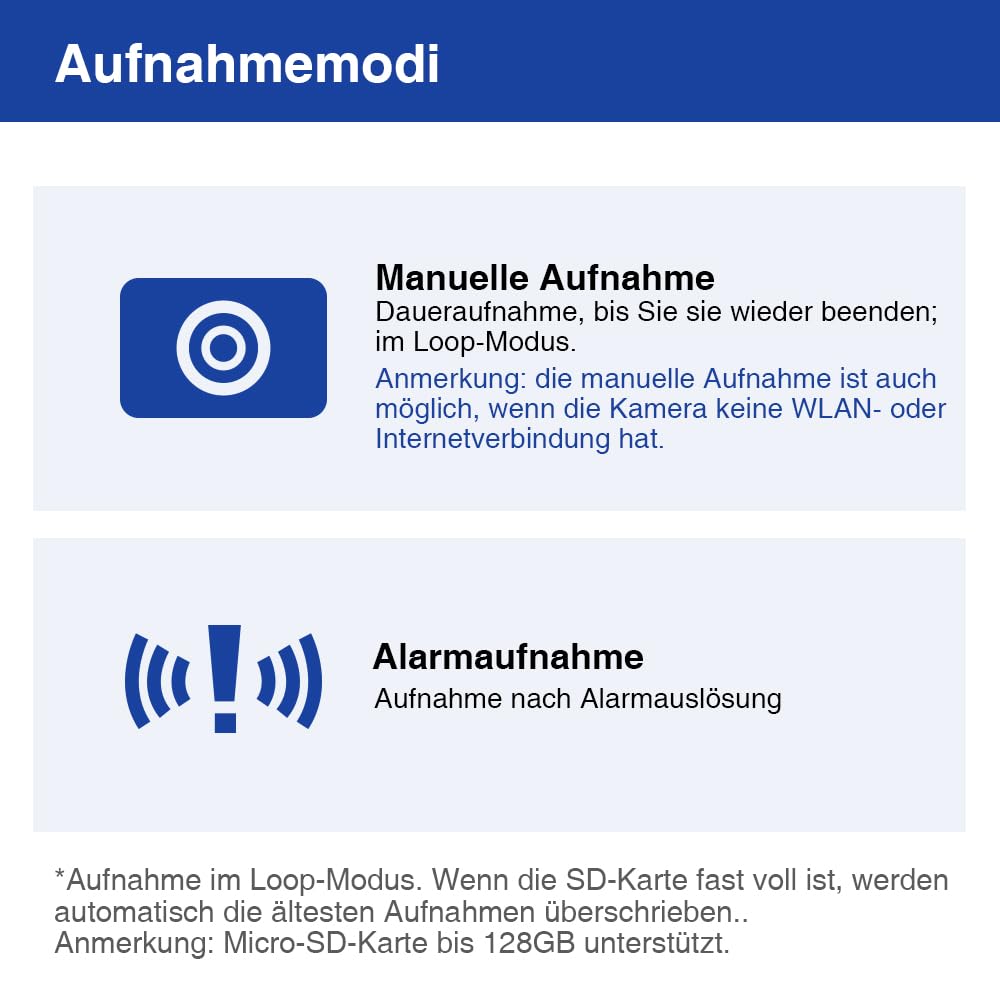 ["microSD recording with various options"] The camera supports continuous loop recording (requires a microSD card, not included). Additionally, the camera can record without WiFi or internet, making it ideal for use as a digital camera in a car, bike, or other outdoor activities. Recording in case of an alarm is also available.