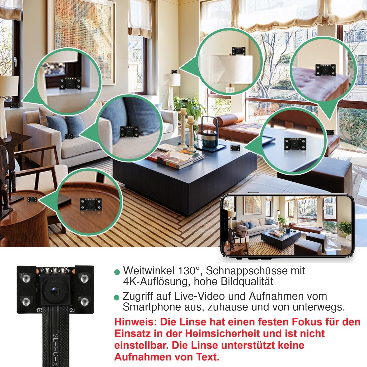 ["Mini size, 2K resolution, Night vision"] This camera is small, even smaller than a 1 euro coin, but supports 2K live video at 15 fps. Thanks to the 130° wide angle, it captures high-quality images day and night with advanced IR LED technology that provides clear vision up to 6 meters at night. You can access the camera from home or on the go as long as your phone has 4G/5G/WiFi. (Note: Doesn't capture text on paper or screen. The lens focal length is fixed and cannot be changed - specifically designed for security purposes.)