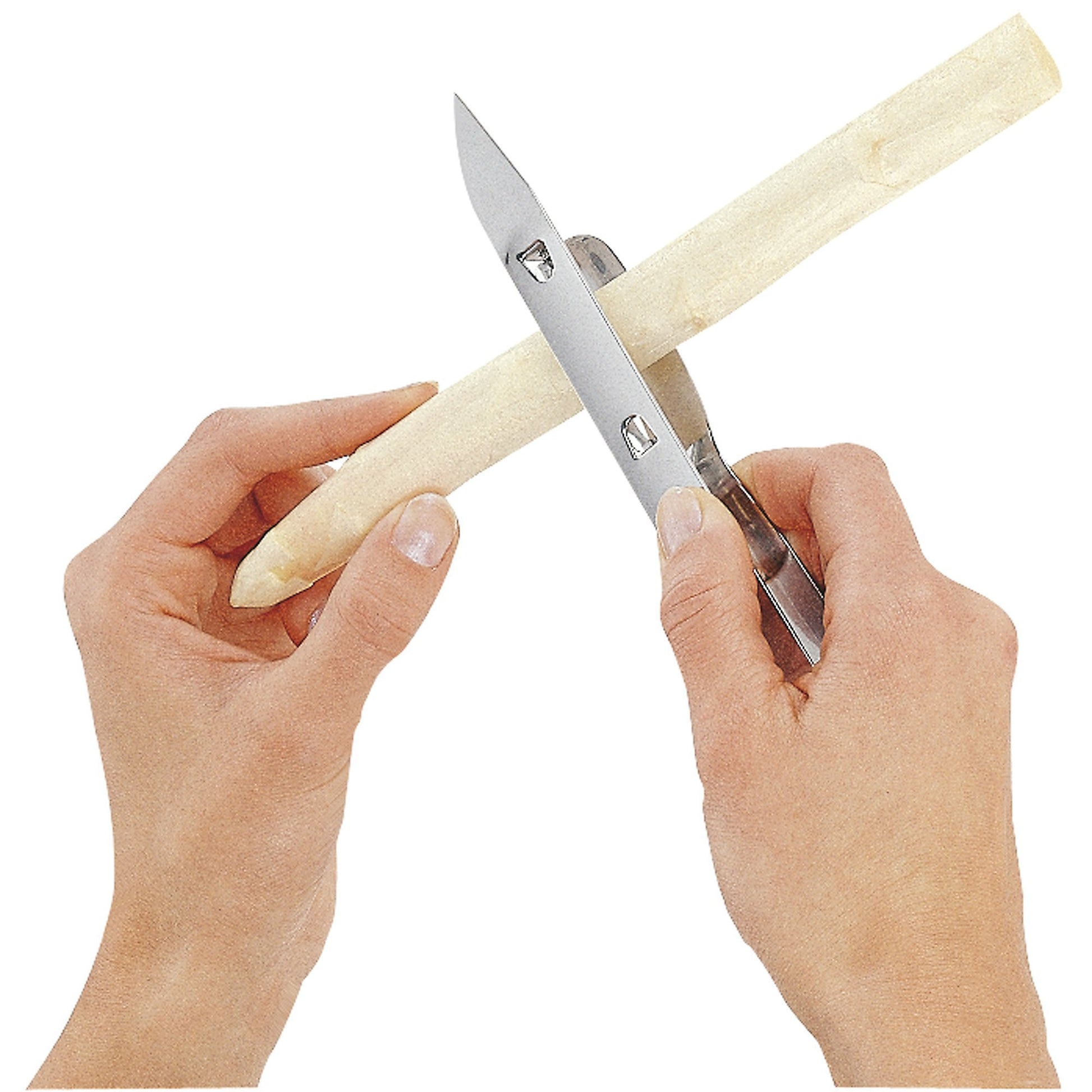["Product 1: Length: 19 cm - Item number: 1871556030","Product 1: Material: Cromargan stainless steel 18/10 partially matt. Rustproof, dishwasher safe, dimensionally stable, hygienic, acid-resistant and indestructible.","Product 1: The functional parts are firmly cemented in the handle. With a practical eyelet for storage on a hanging rail with hooks.","Product 1: Design: Heinrich Fiedeler.","Product 2: Contents: 1x asparagus peeler (Length 17 cm) - Item number: 1892519990","Product 2: Material: Cromargan stainless steel rust-free 18/10, polished - dishwasher safe, easy to clean, durable, tasteless and acid-resistant","Product 2: The asparagus peeler is specially designed for peeling asparagus. The blade tip of the asparagus peeler is ideal for cutting off asparagus ends","Product 2: The movable blades adapt optimally to the contours of the asparagus. Thanks to the pliers shape, the asparagus can be cleanly fixed while peeling, preventing the vegetable from breaking"]