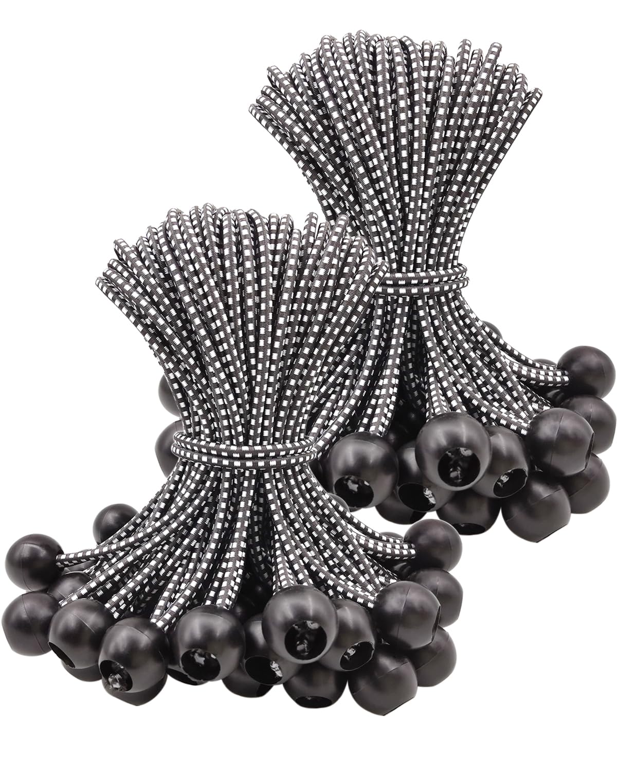 ["MATERIAL: 100 pieces of 15cm bungee cords with ball made of high-quality latex and polyester. They are elastic, weather-resistant, durable, and resistant. Can be stretched to 30 cm.","FEATURES: UV-resistant and weather-resistant to withstand the toughest conditions, designed for outdoor camping.","USE: Elastic bungee cords with ball can be easily pulled through the eyelet and support and then locked in place with the ball. You can use multiple bungee cords with ball to get additional lengths.","OCCASION: Our tent bungee cords with ball are suitable for tarps, camping, boat shelters, tents, waterproof covers, gardens, railings, caravans, shading nets, fishing umbrellas, curtains.","GIFT: You can use bungee cords with ball with balls yourself or give it as a gift to your family, friends, lovers, and colleagues."]