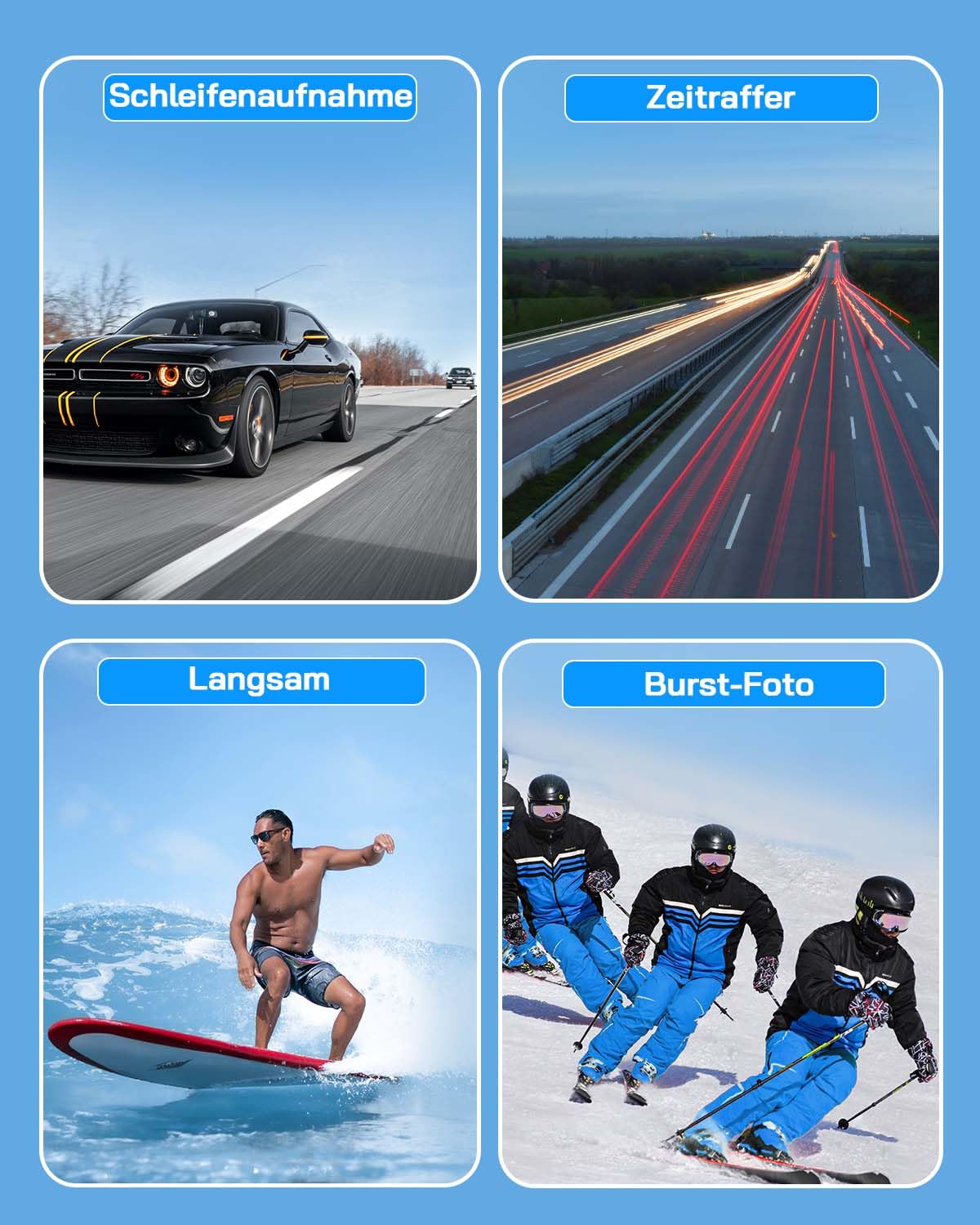 🚴♀️【EIS Image Stabilizer & Multi-Mode】 The GA100 is equipped with EIS anti-shake function that significantly improves video stability and smoothness, capturing the wonderful moments of sports easily. This time-lapse camera offers a variety of shooting modes such as selfie, continuous shooting, timed shooting, time-lapse shooting, loop recording, slow motion, and automatic mode, etc.