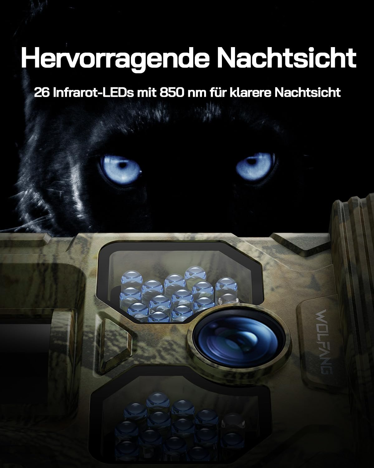 ["đăSolar powered and battery savingăThe WOLFANG WT02 Solar Wildlife Camera features a built-in 2500mAh battery that can be powered by the solar panel attached above. It reduces battery consumption, saves money and time, and protects the environment. And with the additional battery pack providing extra power, the battery life is very long (Warm Tip: Please use 4 AA batteries for better performance in low temperatures. It is recommended to charge the solar energy before use).","đăNever shut down, super long standby modeăLithium battery (main power supply) plus 4 * AA batteries (not included, if you need batteries, please contact us). WT02 can be continuously used for up to 8 months (depending on the frequency of shots, consider suitable light and solar energy to supplement power).","đŠă4K@30FPS resolution and 48MP imagesă48MP images, 4K 30fps recordings, all captured objects are clearly visible. Equipped with 26pcs 850nm infrared LEDs to provide up to 65ft night vision range, it can provide clear night pictures and videos in complete darkness.","đŠ