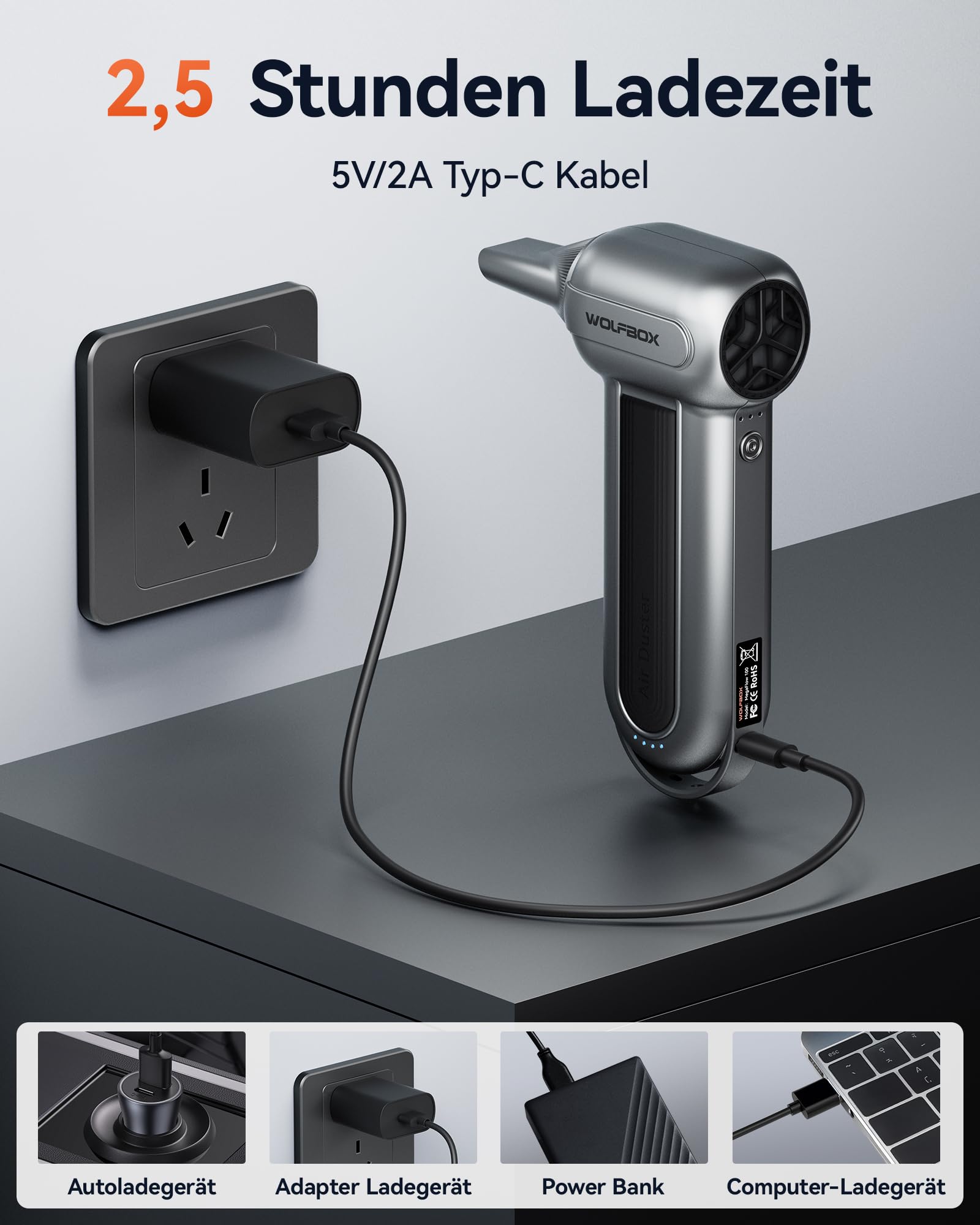Versatile cleaning tool: With its 5 nozzles and 2 brushes, the electric WOLFBOX air cleaner is perfect for cleaning electronic devices such as PCs and keyboards, as well as for use at home, in the car, and outdoors. It is also great for inflating equipment or managing bonfires, making it a must-have for various scenarios.