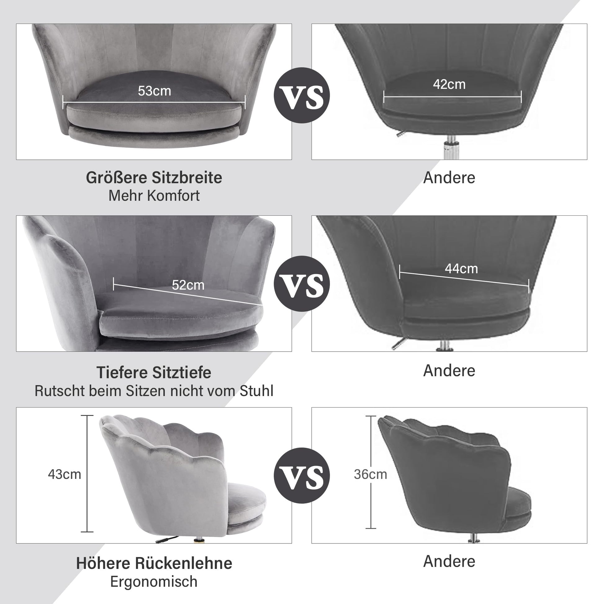 More space, free movement of shoulders and back: The seat width of ordinary chairs is usually 38-42 cm, while this chair offers a seat width of up to 53 cm and a seat depth of up to 52 cm. This allows you to sit comfortably without having to squeeze your shoulders. Especially suitable for people with broader shoulders or for winter when wearing thick clothing. Never again feel the uncomfortable sensation of your shoulders being pinched by the chair!