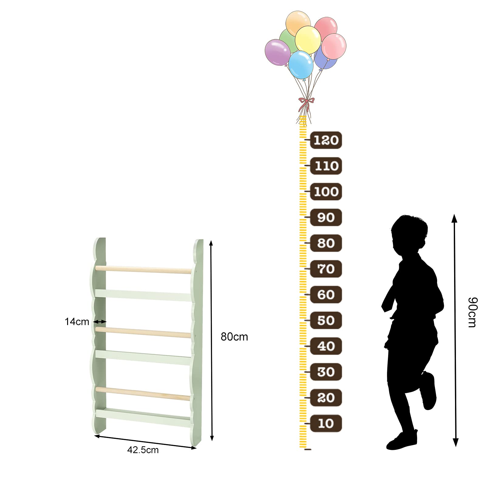 ["SAFETY FIRST: The water-based paint, rounded edges, and EU safety certification create a safe children's shelf. The additional rod and raised edge on each level of the shelf protect toys, books, and magazines from falling down","SOLID STRUCTURE: Made of E1 quality MDF and pine wood, the children's wall shelf is quite sturdy. The wall mounting is stable and space-saving, allowing your children to use the shelf safely and enjoy searching and reading books","FLEXIBLE SETUP: Placing books facing the children's bookshelf will capture children's attention and spark their interest. With this children's shelf mounted at the ideal height, kids can easily reach desired items","SIMPLE LOOK & FRESH COLOR: Available in white, gray, and green, this bookshelf is perfect for creating an ideal environment for your children to learn and tidy up independently. It is also ideal for rooms","EASY INSTALLATION: A detailed, illustrated installation guide and accessories are included with this children's bookshelf. It can be easily mounted on the wall. Overall dimensions: 42.5x80x14.5cm (WxHxD)"]