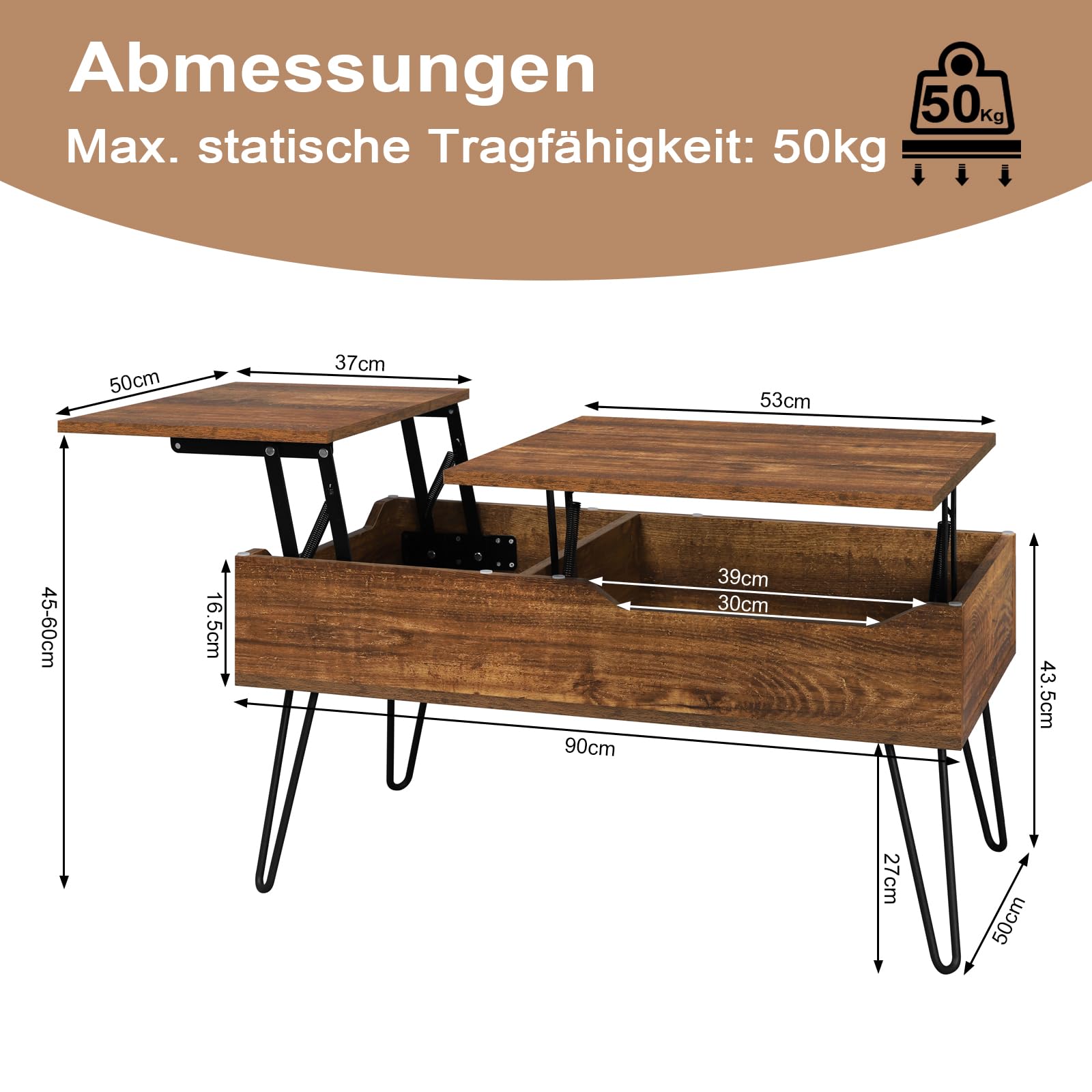 ["LIFT OFFICE TABLE: This practical coffee table has 2 large lift-up panels so you can comfortably work or eat with friends and family; when you close the panels, it transforms into an elegant coffee table that meets all your needs","ENOUGH SPACE: When you lift up the 2 table tops (large: 50x47 cm; small: 35x47 cm), you will find 2 compartments where you can store anything you want, such as magazines, snacks, chargers, etc., to bring more order to your home","RELIABLE QUALITY: Thanks to high-quality wood material and solid metal legs, the table is durable, stable, and easy to clean. The metal spring lift system smoothly raises and closes the table tops, making them convenient to use","VERSATILE: With its rustic wood look, beautiful lines, and original V-shaped legs, the small table is attractive and adds a modern touch to your space. Ideal as a desk, dining table in the living room, work table, coffee table, etc.","EASY ASSEMBLY: In addition to the coffee table, you will also receive an instruction manual so you can immediately get started on the fun of assembling the product with your own hands. Dimensions: closed – 90x45x50 cm, extended – 115x60x75 cm"]