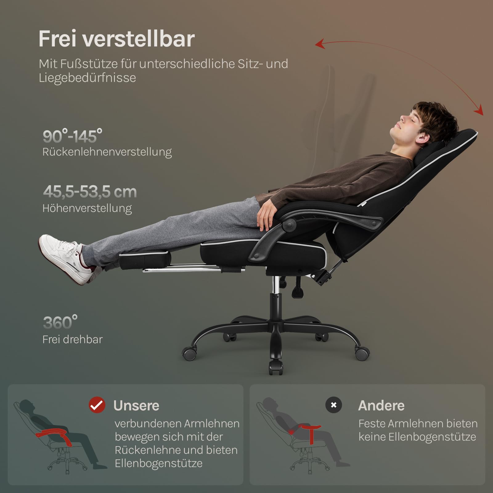 ["BREATHABLE, COMFORTABLE SEAT: The gaming chair seat is made of breathable pocket springs, foam padding, and a mesh fabric cover for a refreshing, comfortable seating experience. It provides good air circulation and temperature regulation, as well as excellent elasticity and support, avoiding discomfort from heat and moisture buildup and allowing you to withstand the hot summer. The mesh fabric is durable, as it is breathable, dirt-resistant, and wear-resistant.","STURDY AND STABLE STRUCTURE: The high-back office chair has a strong metal frame and is supported by the SGS-tested gas spring and the metal base with five 360-degree swivel casters, tested by BIFMA for stability, durability, quiet and flexible movement 10,000 times. Weight capacity: 330 lbs","WIDE PADDED, FLAT SEAT: Unlike a regular gaming chair with a seat surface flanked by small wings on two sides, the WOLTU gaming chair features a wide and flat seat surface, providing a large area for your hips and thighs and allowing for comfortable seating, suitable for all body types","ERGONOMIC DESIGN: The ergonomic home office chair conforms well to your body's curves. With the adjustable head and lumbar pillows to support your neck and lower back, the height-adjustable and 360-degree swivel seat, connected armrests that automatically adjust to the angle (up to 145 degrees) when reclining, and the foldable footrest, you can relax comfortably","EASY ASSEMBLY: The computer chair comes with illustrated instructions, necessary accessories, and tools for easy and quick assembly. Note that the protective cap on the gas spring should be removed before assembly. The chair frame is made of FSC-certified wood"]