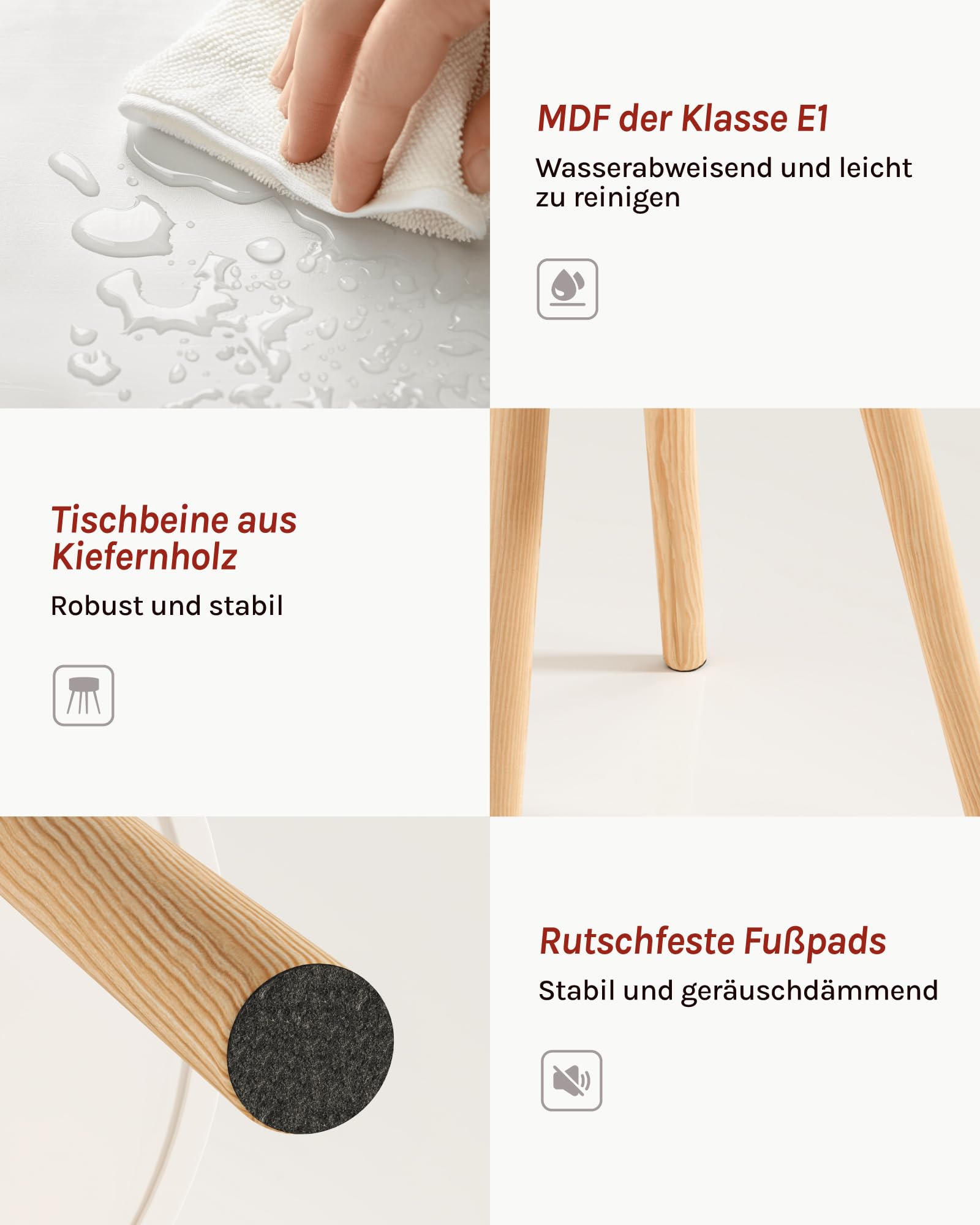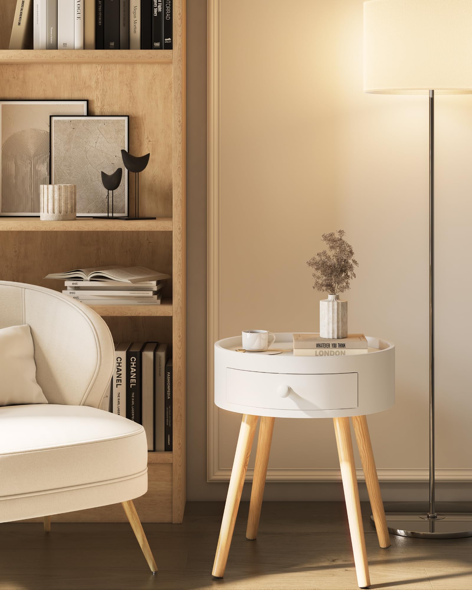 "\"PRACTICAL DESIGNS: With dimensions of 38x45.5 cm (φxH), this nightstand is compact, lightweight, easy to move, and space-saving; the raised edge prevents items from falling off; the included non-slip foot pads protect the floor from scratches and increase the stability of the table","STORAGE SPACE: The lamp, alarm clock, cup, and other items can be placed on the round tabletop; small items like keys, remote controls, chargers can be neatly stored, organized, and easily found in the drawer","STURDY AND DURABLE: The main part of the product is made of FSC-certified wood. The body of the small nightstand is made of painted E1 grade MDF, which is sturdy, water-resistant, and easy to clean; the pine wood legs with a diameter of 3.5 cm and a spread structure increase stability; the drawer is equipped with a stopper to prevent items from falling out","STYLISH AND MODERN: The white nightstand is simple and elegant, suitable for various rooms and decor styles. It can also be used as a side table, end table, sofa table, or coffee table","EASY AND QUICK ASSEMBLY: No tools are required. Simply screw the solid wood legs into the bottom of the table and in a few minutes, a stylish nightstand with drawer is ready. The assembled nightstand is strong, stable, and does not wobble""