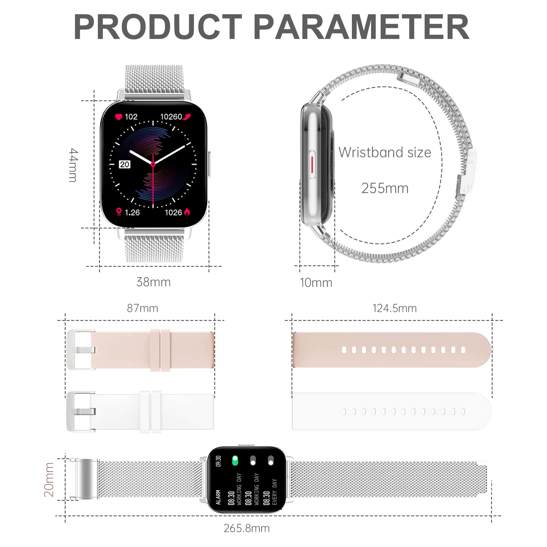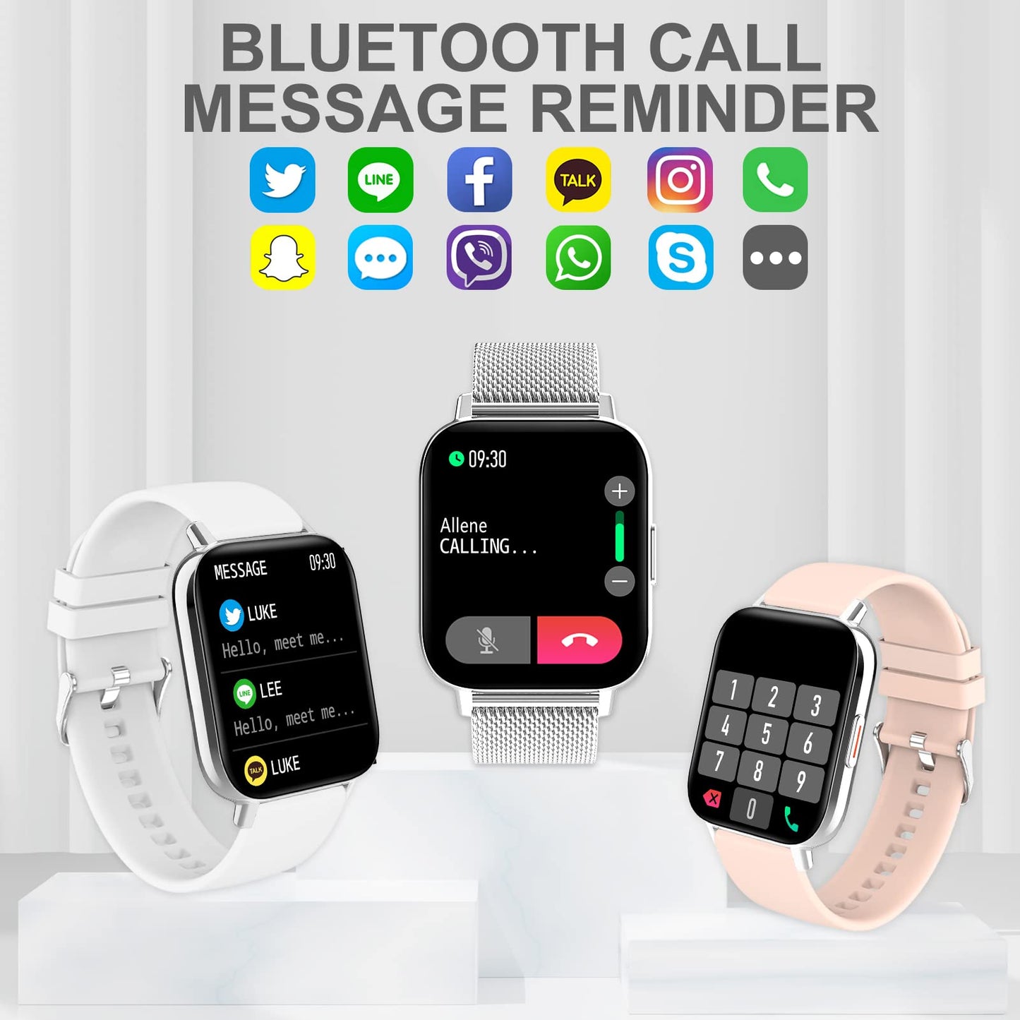 ["BLUETOOTH CALLS AND SMART NOTIFICATIONS: The ladies' smartwatch is equipped with a speaker and microphone. Once you've connected the watch and your phone via Bluetooth, you can answer and make calls without losing them. You can read messages, emails, and notifications (WhatsApp, Facebook, Instagram, etc.) without using your smartphone. The smartwatch vibrates slightly to remind you. Never miss an important notification.","ELEGANT DESIGN WITH OVER 100 WATCH FACES: This women's watch has a high-resolution screen, providing better visual quality and a silky touchscreen effect. Choose from over 120 watch faces. Personalize your watch face with your favorite photo and select from three different bands, the silver stainless steel band is elegant, the pink and white silicone bands are comfortable. Choose the look you prefer every time.","CONTINUOUS HEALTH MONITORING: The women's watch is equipped with a high-performance health sensor that monitors your heart rate, blood oxygen saturation, and blood pressure. If worn during sleep (9:00 pm to 9:00 am), the watch automatically tracks your sleep and analyzes your sleep quality. The women's watch also reminds you to move, drink water, and track your menstrual cycles. Always keep an eye on your health.","FITNESS TRACKER AND 8 SPORT MODES: This women's fitness watch is designed to accurately track and record your daily activities, steps, calories, and distance. With 8 sports modes to choose from (walking, running, cycling, jump rope, soccer, badminton, and basketball), it helps you stay fit by recording calories, real-time heart rate, steps, and activity duration, adapting to your workout needs and helping you track your progress.","PRACTICAL FEATURES FOR AN INTELLIGENT LIFE: Our digital watch also has many small features such as alarms, weather forecasts, sedentary reminders, water reminders, breathing exercises, music control, camera. The sports watch can be used for 3-7 days after 2.5 hours of charging time (Note: Depending on individual usage). With the IP67 waterproof function, you can wear the watch while washing your hands and working out (not suitable for hot water or seawater)"]