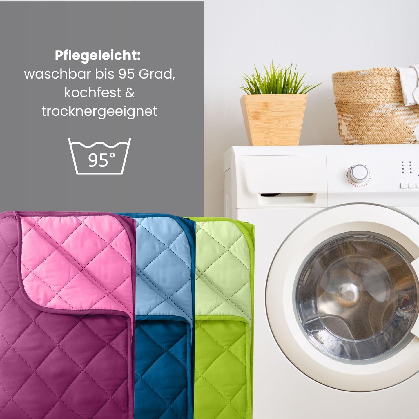 ["Microfiber summer quilt with soft reversible cover - the perfect camping blanket or super light summer blanket","Great for traveling or camping - can be used without additional bedding. Easy to roll up and store quickly and easily! Machine washable at 95°F!","Color: turquoise and light blue - certified according to STANDARD 100 by OEKO-TEX (Test number: 13.HCN.35295 Hohenstein HTTI)","Size: approx. 155x220 cm - Material composition: Cover made of 100% polyester microfiber, filling made of 100% polyester","Care instructions: washable at 95°F, machine washable and suitable for tumble drying"]