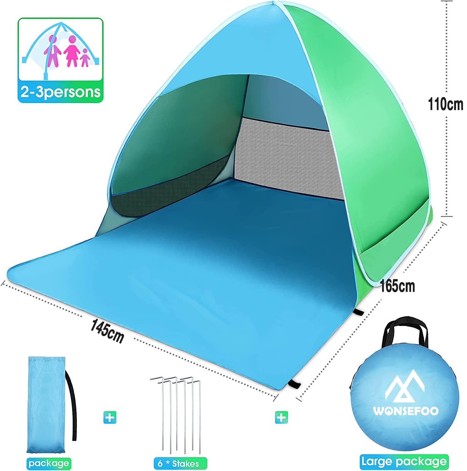 WONSEFOO Beach Tent UV Protection 50+ | 2-3 Person Beach Shelter | Pop-up Waterproof Portable Instant Tent | Beach Canopy for Family Camping Garden Beach