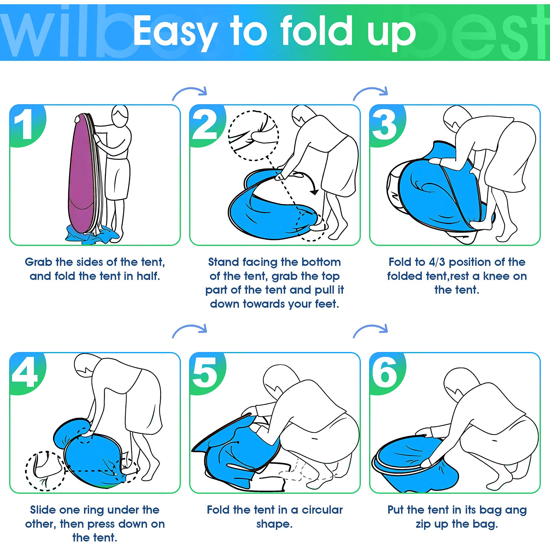 "Instant popup design, no assembly required - After taking it out of the bag, you can set up this tent in seconds. You can save a lot of time setting up a tent, and folding it is also quite easy. With our automatic popup tent, you can enjoy the outdoors immediately. Remember to keep your children or other fragile items away from the tent when preparing to open it."