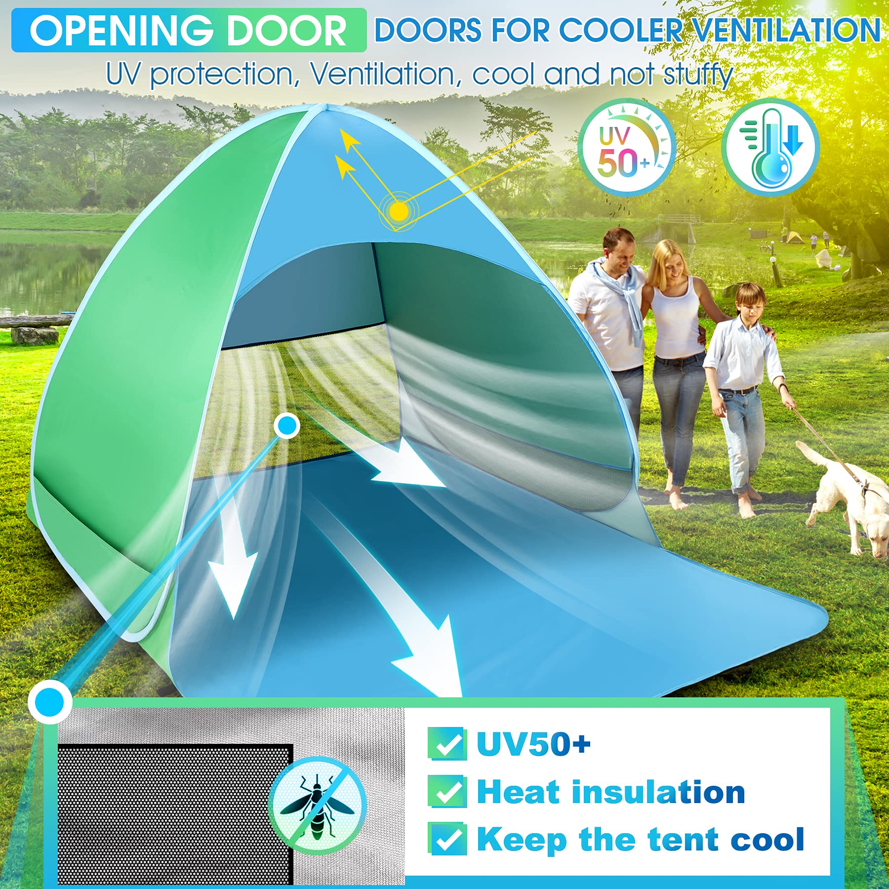 "UV Protection 50+ Safe and effective - The beach tent is made of environmentally friendly 190T Polyester Oxford fabric and 50+ Anti-UV coating. Its surface reflects and absorbs sunlight to block harmful ultraviolet rays, protecting people from UV rays. Non-toxic, odorless fabric material, perfect for children and people with sensitive skin. So you can choose our UV 50+ beach tent for all outdoor activities, especially for family trips."