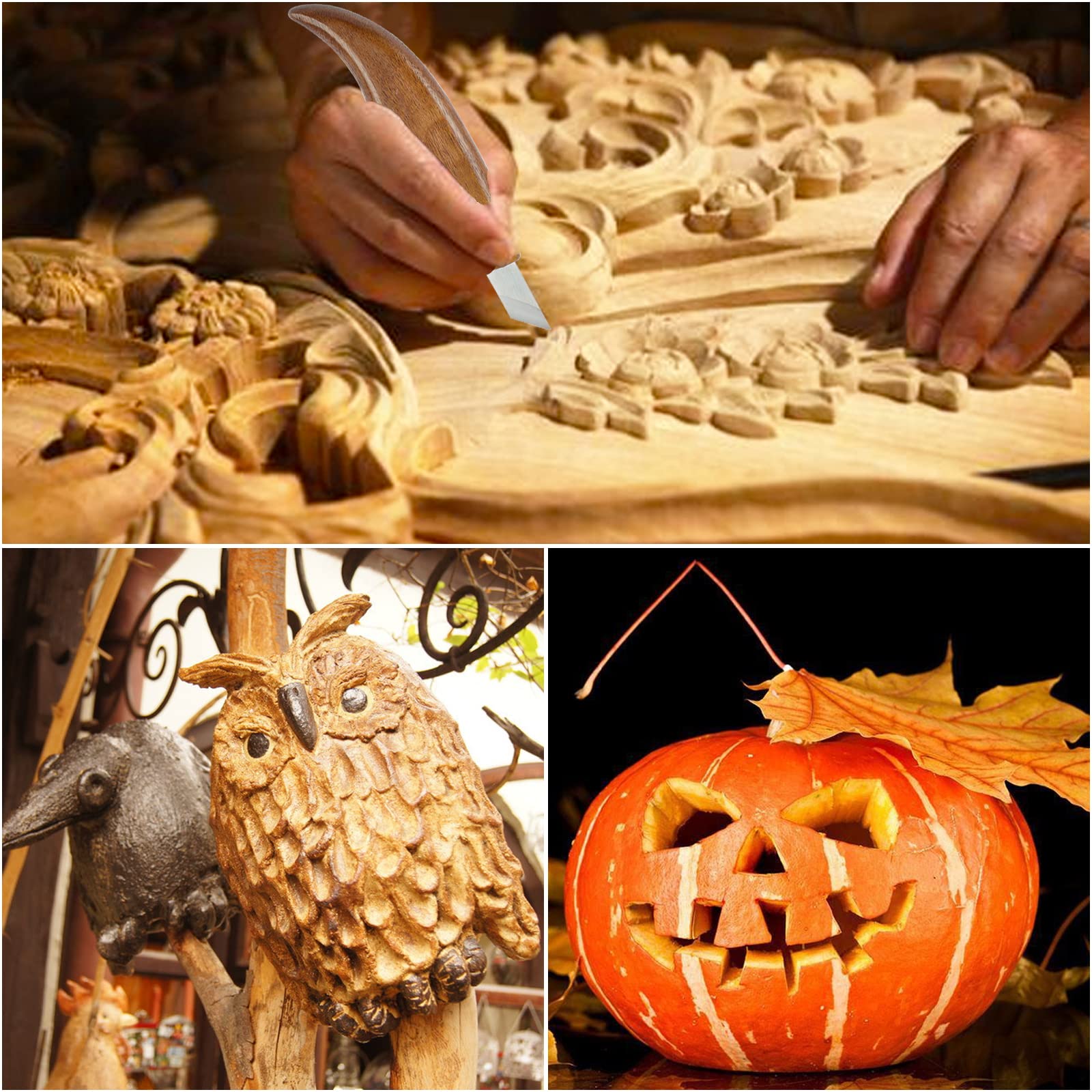 【The Set Includes】: 5 Whittling Knives + 1 Polishing Belt + 1 Oil Wax + 2 Cut-Resistant Gloves + 1 Roll Storage Bag. Suitable for all types of wood carving, from rough carving to fine carving, it is a complete set of woodworking tools. Our carving knife set is ideal for carving soft woods such as maple, pine, lime, poplar, pumpkin, etc."