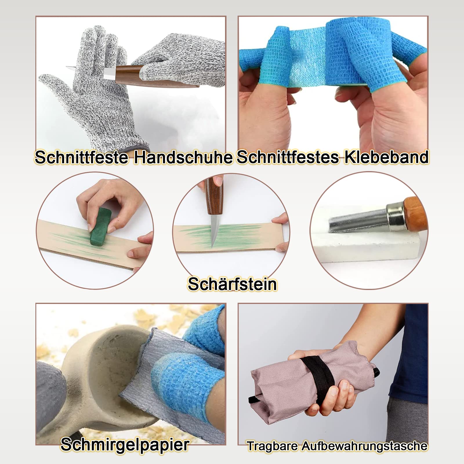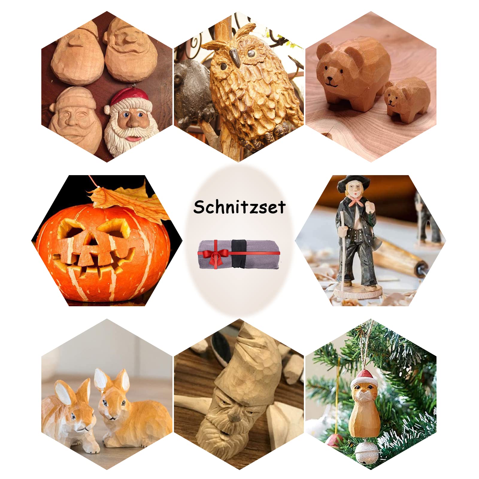 ["[32 in 1 Carving Set] This carving set includes 3*carving knives (rough carving), 12*carving knives (fine carving), 4*small wooden blocks (1*1*4 inches), 2*large wooden blocks (2*2*4 inches), 4*sandpaper (180/320/600/800), 1*polishing strip, 1*grinding stone, 1*tape, 1*cut-resistant gloves, and 1*portable canvas bag. A complete and versatile set for your different carving needs, whether rough or fine.","[Sharp and Durable] The handles of this set of wood carving tools are made of high-quality wood that is not easily deformed or cracked and feels comfortable in the hand. The blades are made of a chrome vanadium alloy and carbon steel, which are hard, rust-resistant, and durable, staying sharp for a long time during carving.","[Ergonomic Design] This carving tool set is ergonomically designed with a smooth and comfortable grip, smooth lines, and a compact and compact structure that allows you to hold it securely, suitable for both adults and children, giving you the flexibility to use it. And you can work continuously for many hours without tiring your hands.","[Safety in Use] For safety in use, we have included 1*cut-resistant tape and 1*cut-resistant gloves for you, as well as a transparent protective cover for each carving knife to ensure your safety. If used by children over 6 years old, it is recommended to be accompanied by a parent and not recommended for children under 6 years old.","[Wide Range of Applications] Each carving knife in this carving set is designed for a specific purpose. You can use it to start your craft DIY and make anything you want, such as DIY dolls, spoons, bowls, cups, pumpkins, woodwork, carving, shaping, cutting, wood grain, scraping, and crafting.","[The Perfect Gift] This carving knife set is a great gift for children, beginners, amateurs, or even professional woodcarvers. Whether for Easter, Christmas, New Year, back to school, or birthdays, it can be the gift of choice.","[After-Sales Service] If you have any questions about our KAQ wood carving tool set, please feel free to contact us. Our KAQ team will find a satisfactory solution for you."]