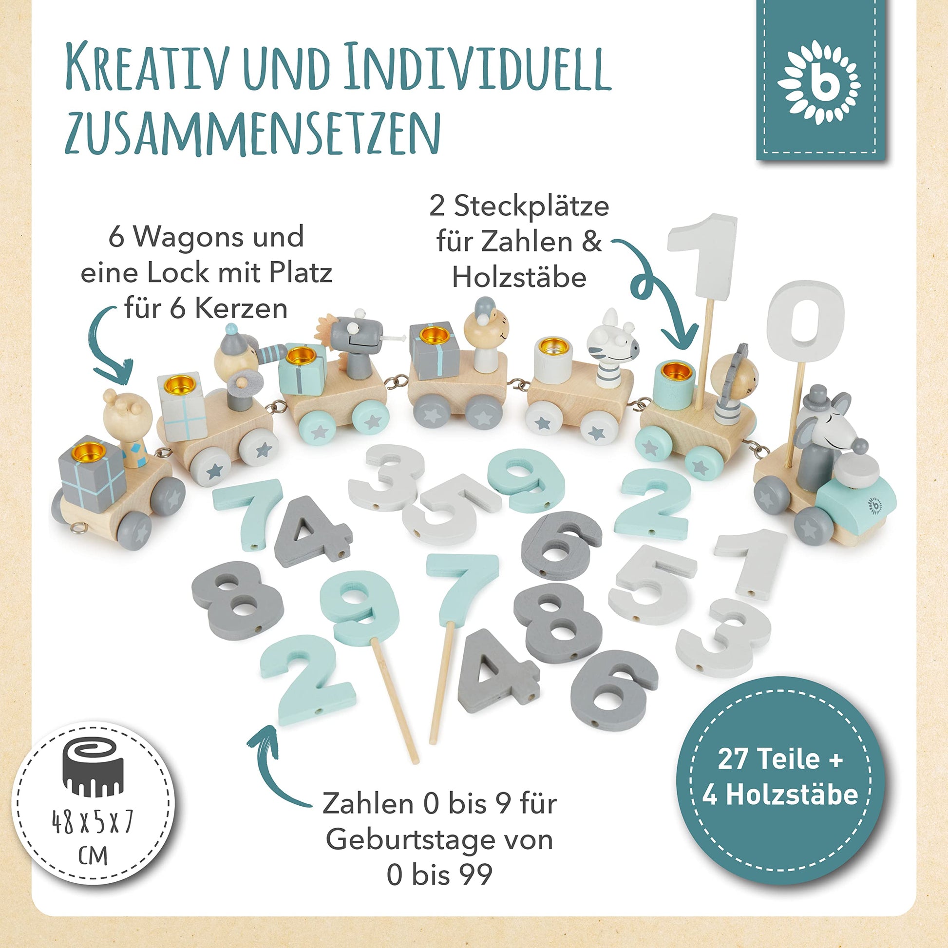 ["FUN & JOY: A birthday train belongs on every perfect children's birthday table. Locomotive and carriages are equipped with small wheels for pushing and pulling the train.","QUALITY: The wooden train in Modern Scandi Design is made of high-quality wood. The colors are saliva-resistant. With holder for 2 numbers and 6 candles.","0-99 YEARS: The wooden train is suitable for all age groups: From birth to old age, it brings joy and is a very special eye-catcher on the birthday table.","FOR EVERY GIFT: Perfect for giving your gift even more expression. The birthday train should not be missing on any gift table.","INCLUDES: 1x Wooden Birthday Train Scandi-Look Animals. Including: 1x 'Loco', 6x 'Carriages' with candle holder, numbers from 0-9, plugs for the numbers. Size approx. 48x5x7 cm. Weight approx. 155 g"]