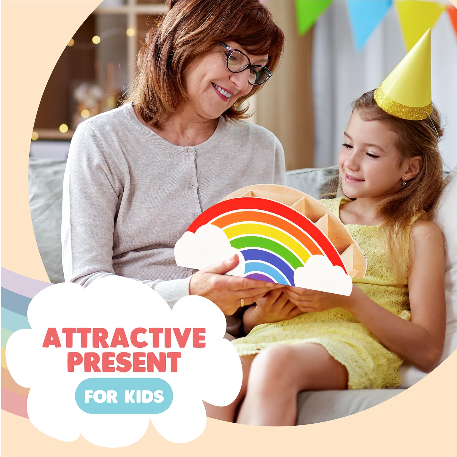 ["Cute design and functional Bring some color to your crafting area with this irresistible rainbow caddy Perfect for storing pencils, colored pencils, sticky notes, scissors, dry erase markers, and more The caddy has 6 compartments of different sizes for your desk accessories","The caddy with sturdy wooden construction measures 11.5 x 4.8 x 2.75 inches L x W x H Made of non-toxic natural wood and environmentally friendly paint, with rainbow print on both sides, suitable for adults or children ages 3 and up","No assembly required You can place it in the office, classroom, vanity, art center, or bedroom This way, you may need fewer containers and organize it better","Keep your desk tidy A colorful pencil holder for storing essential pens, pencils, and stationery This will keep your desk organized and the child's desk clean"]