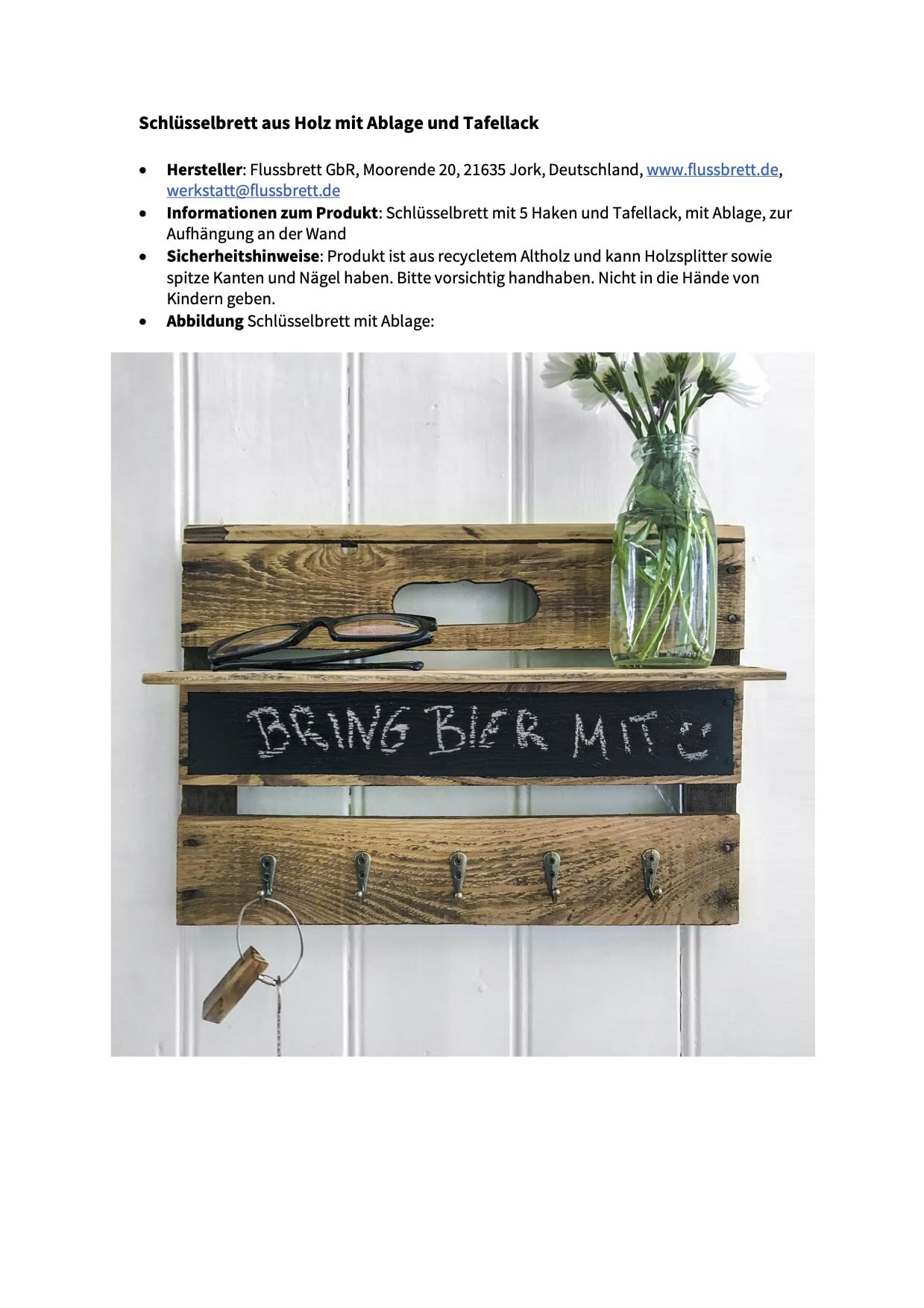 ["Including chalk for small messages","Handcrafted from the wood of an old Altländer fruit crate","Handmade upcycling, each piece is unique","approx. W 37 x H 26 x D 5.5 cm","with five antique-style hooks"]