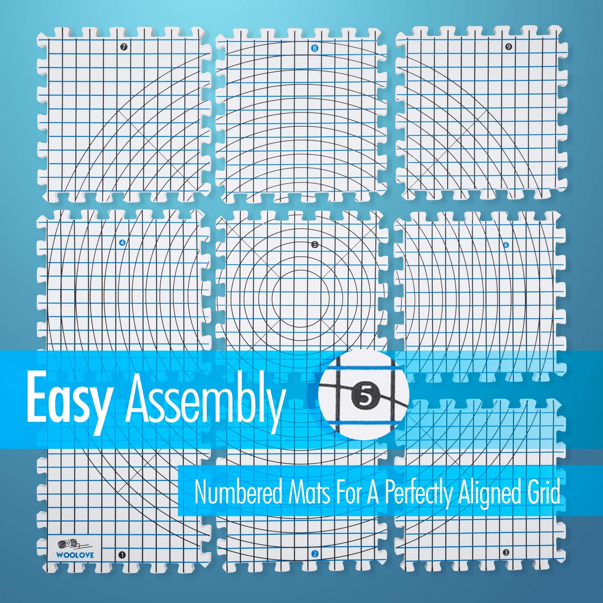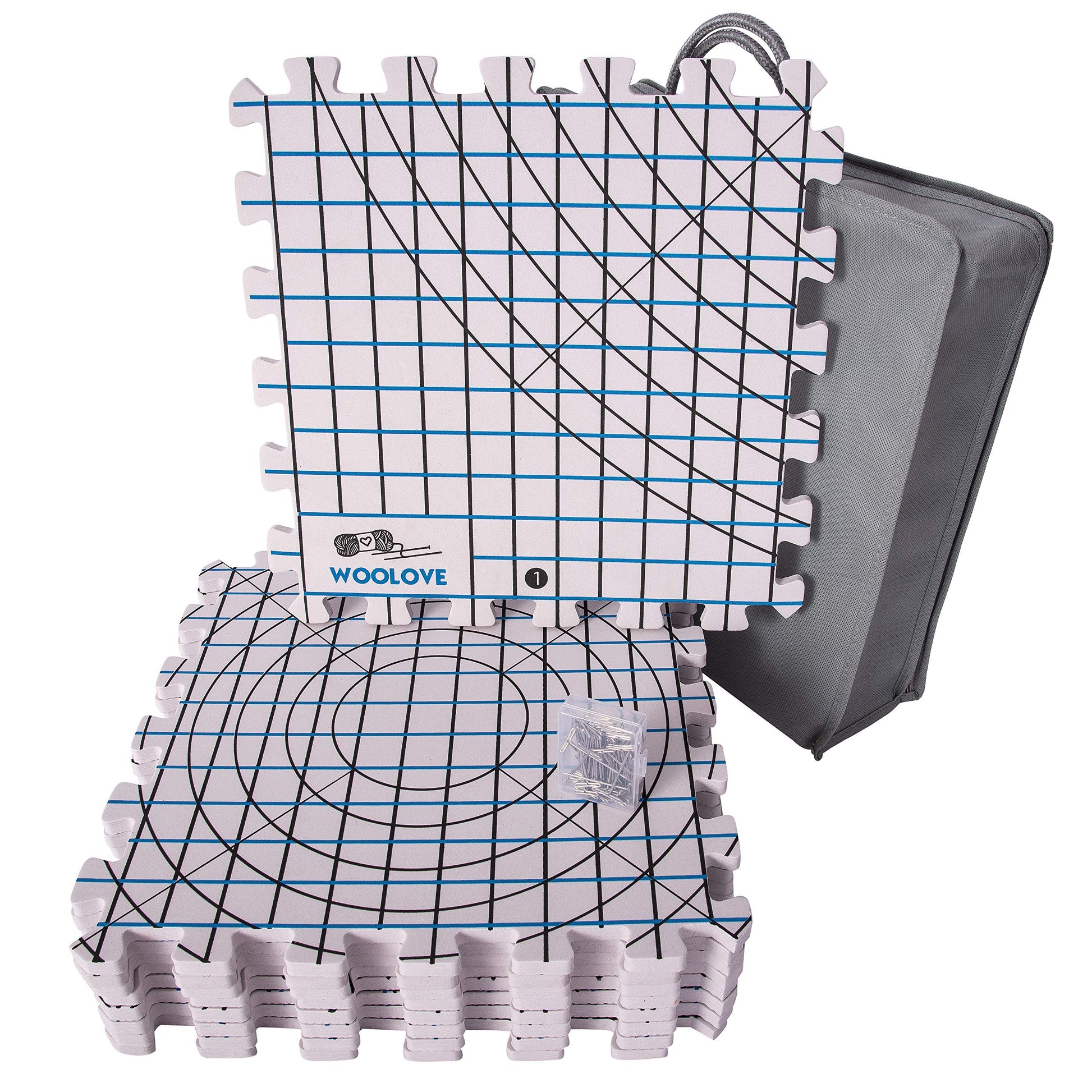 ["Heat resistant, durable, lightweight, and made of high-quality foam, our blocking mats are easy to connect and shape into many forms and sizes.","Printed grids in two colors as markers and numbers on each blocking mat ensure easy and precise blocking of your handiwork, suitable for both beginners and professionals.","Improves accuracy when knitting square blankets, curved armholes, gloves, sweaters, and scarves, and aids in crocheting, crafting, embroidery, needlepoint, etc.","The WooLove blocking set includes 9 blocking boards, 50 T-pins, 1 storage bag for storing your foam blocking boards and blocking accessories.","Each of the 9 square mats in the blocking set is 12.6 x 12.6 inches and 0.4 inches thick"]
