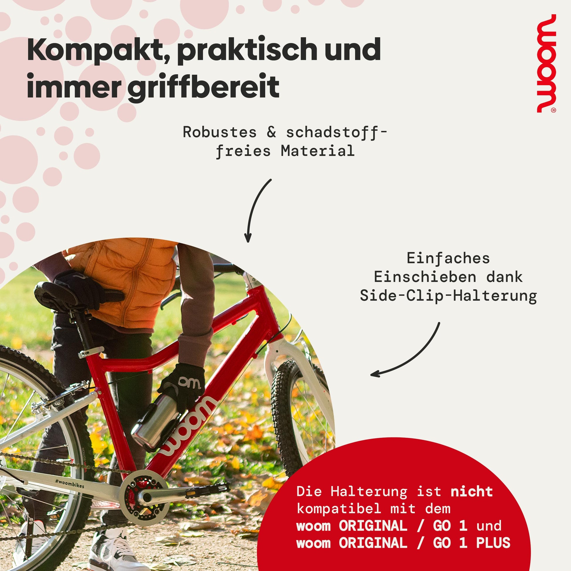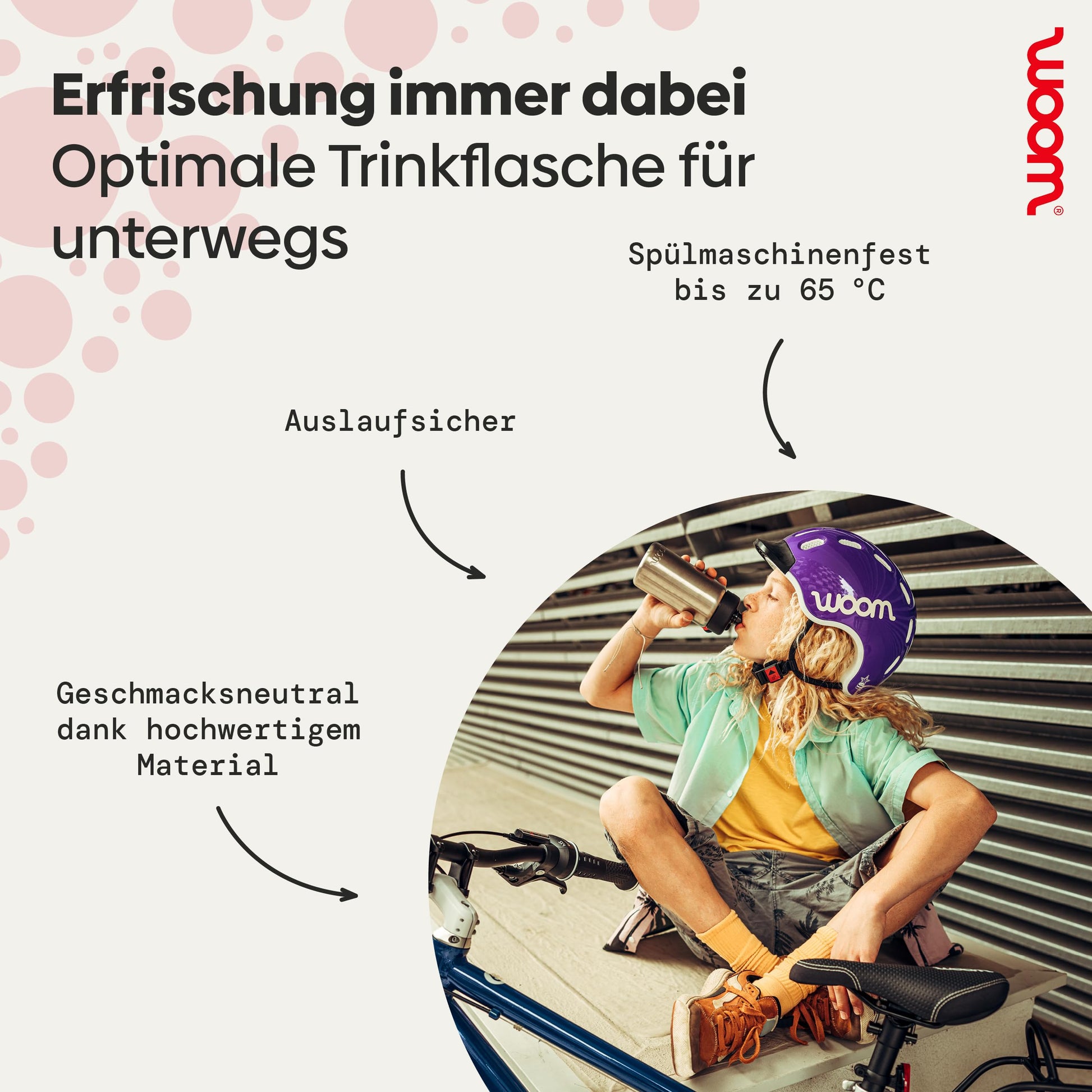 ["Manufacturer: WOOM", "Material: Stainless Steel Water Bottle", "Color: silver Weight: 145 g Diameter: 0.5l Capacity", "Special features: leak-proof and dishwasher safe up to 65 °C", "Application: Fill with your favorite drink, drink during a break", "Feature: ATTENTION: does NOT fit on the woom 1 and woom 1 PLUS wheels; mounting on woom 2 is only possible without fender"]